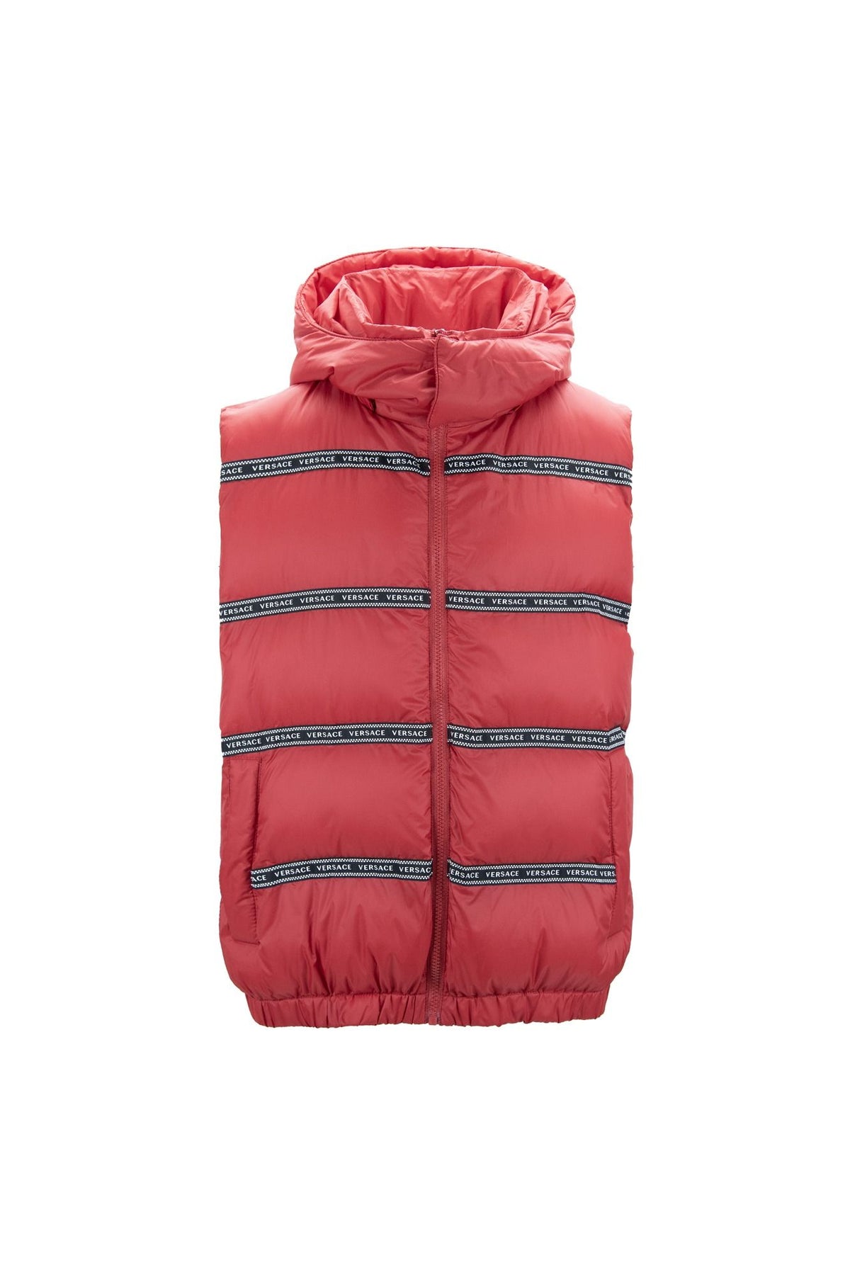Discover opulence in outerwear with this stunning, brand new Versace vest. A harmonious blend of style and warmth, this piece boasts black bands adorned with the iconic white ‘Versace’ logo and a hood that promises versatility with its snap button closure, easily removable by zip. The vest’s elasticated bottom ensures a snug fit while making a statement in its vibrant red hue.
