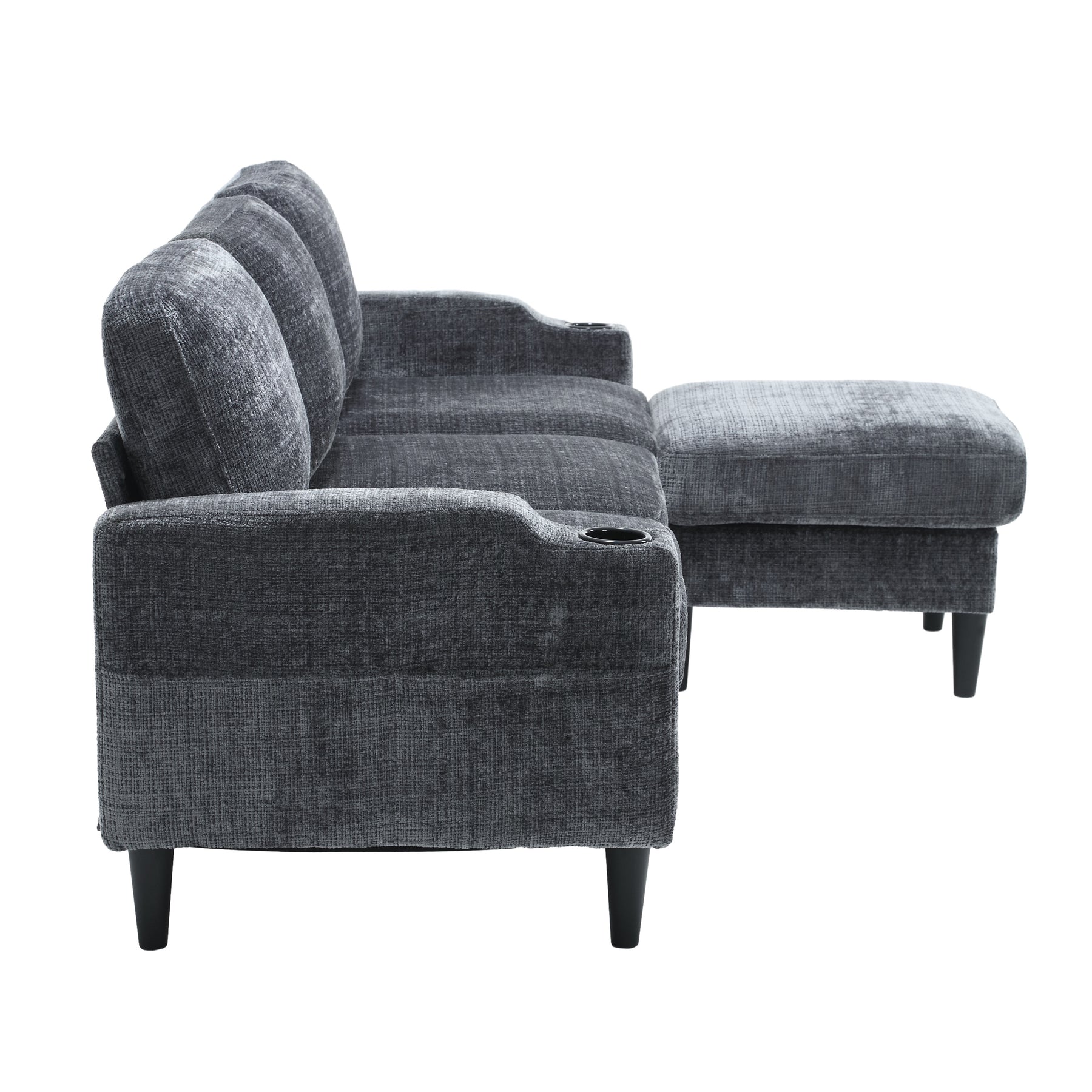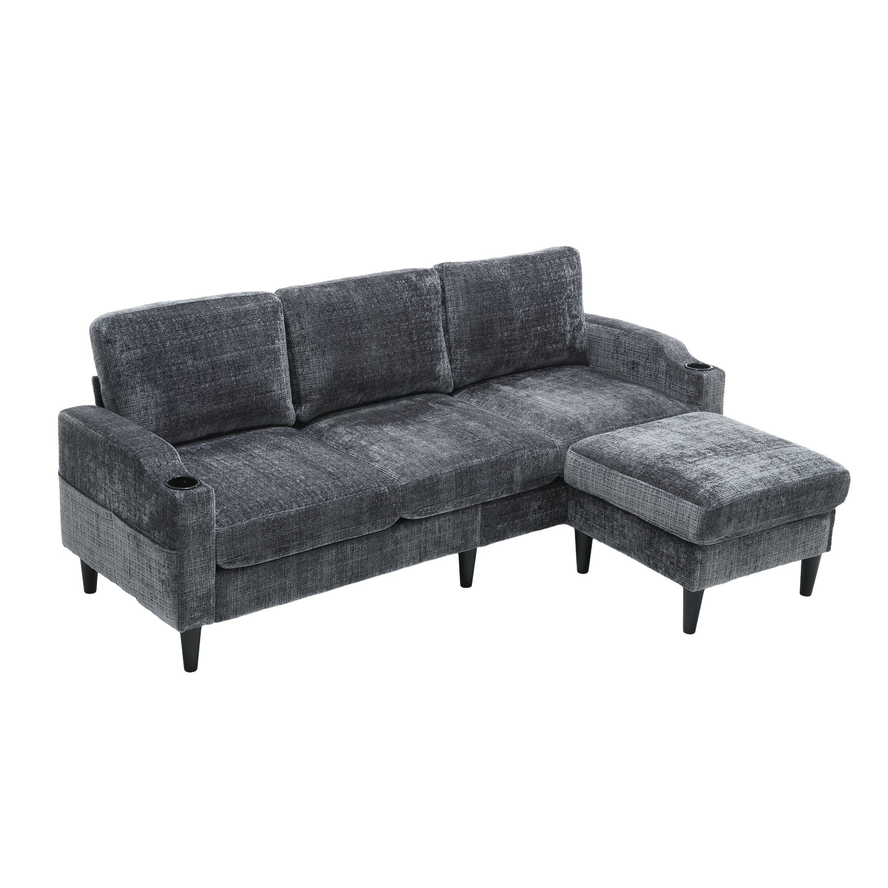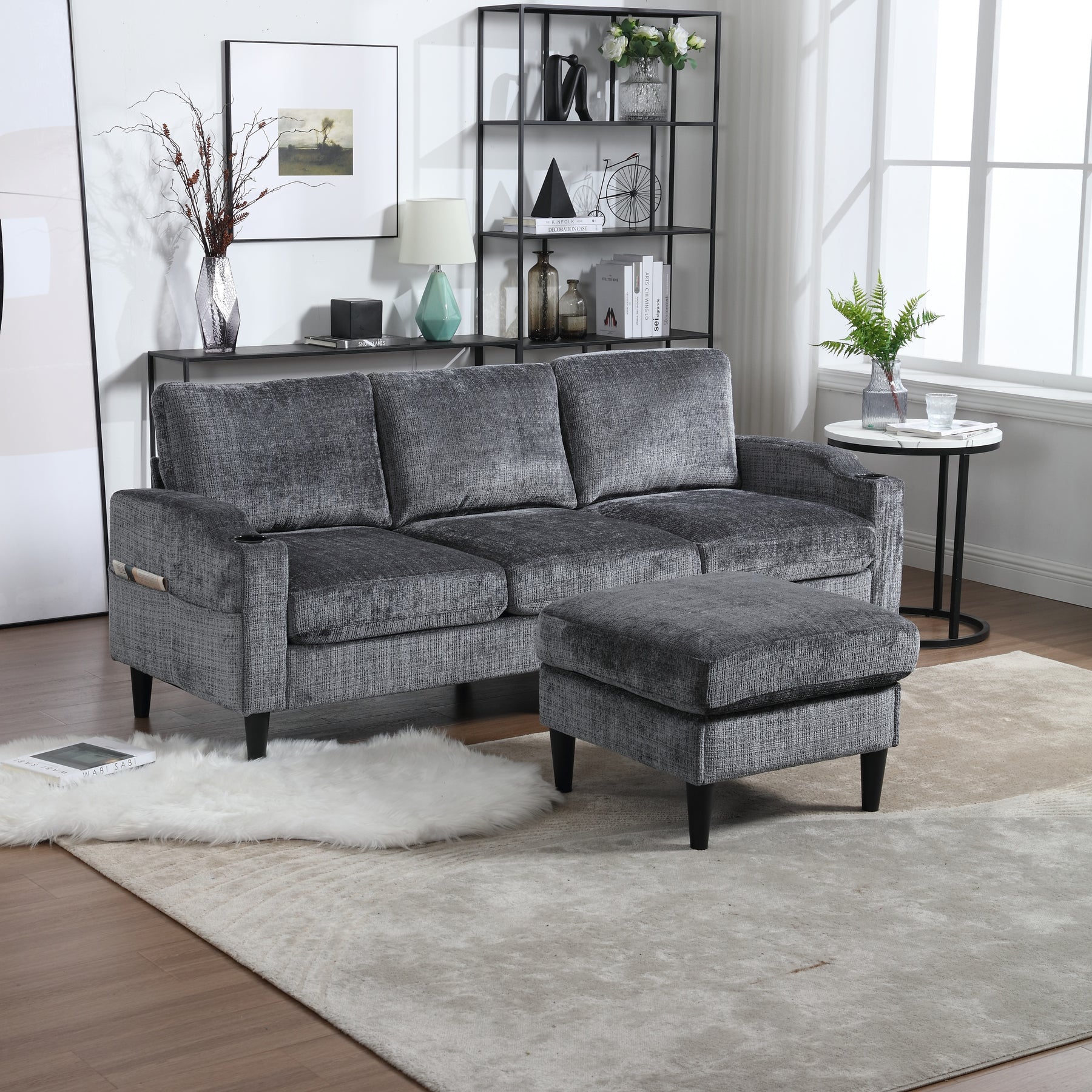 UNITED  WE WIN Sofa for three, solid wood frame, Chenille fabric, side pocket, with two cup holders, footstool with storagestorage sofa /Living room sofa cozy sectional  sofa