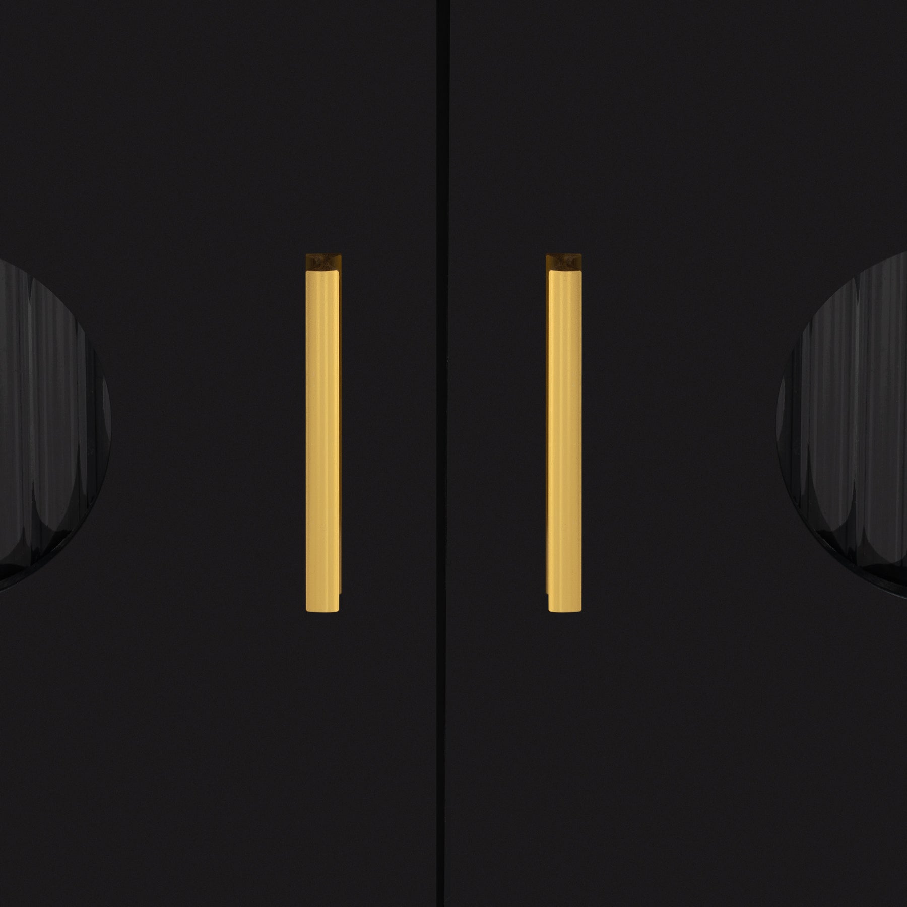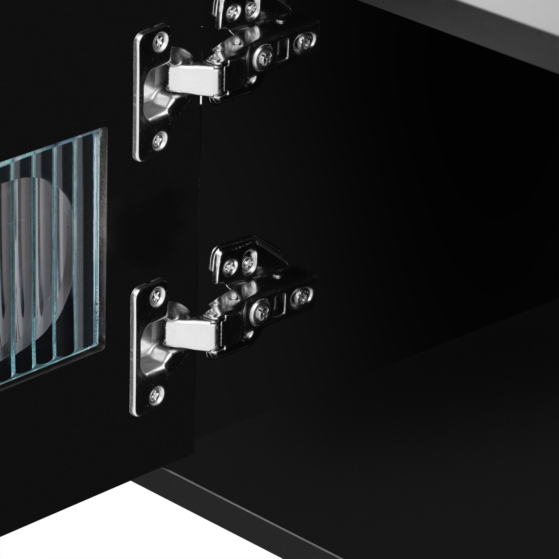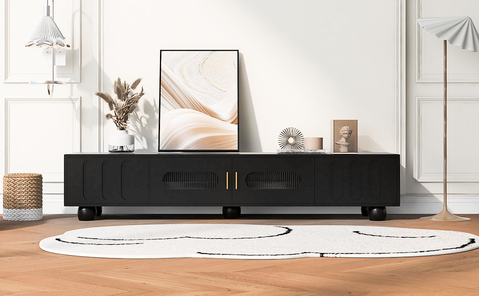 This contemporary and sleek TV stand featuring dual doors and two drawers for a versatile storage layout. The cabinet doors are made of Changhong tempered glass with an elegant arched shape and each drawer door presenting three oval-shaped designs, adding a touch of sophistication to the overall look.