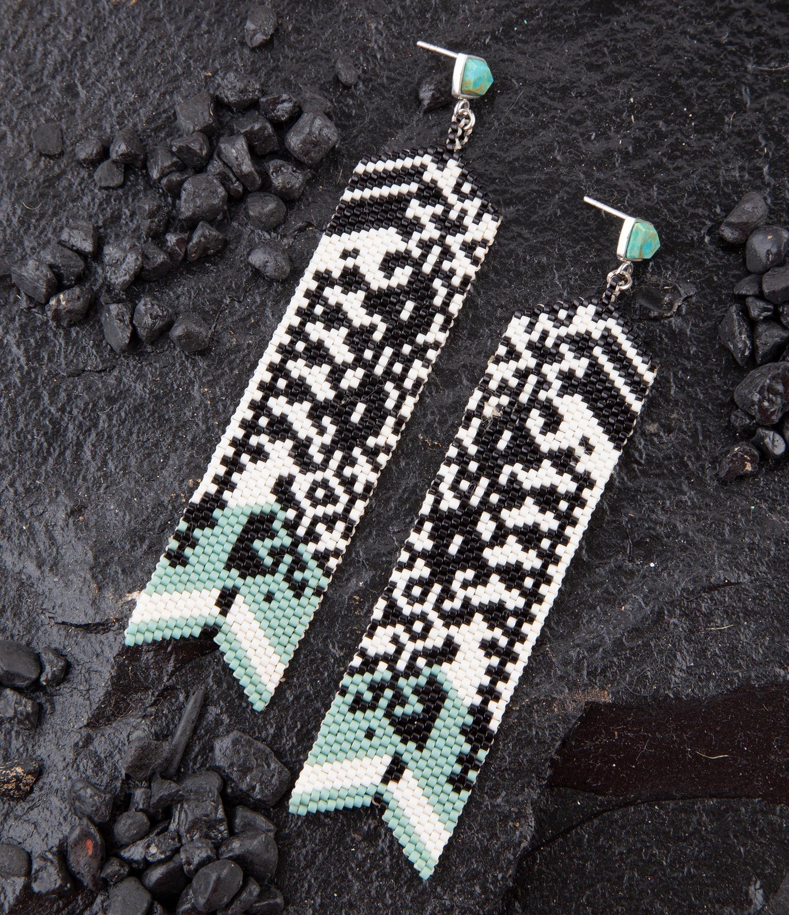 These exquisite Turquoise Long Woven Seed Bead Earrings are handcrafted with the finest genuine sterling silver and genuine turquoise. Beaded in Mexico with Miyuki beads, they'll add a touch of elegance to any ensemble. Hangs 4.5" from a sterling silver post and 1" at its widest point, each earring weighs 5.9 grams including butterfly back. Add a splash of color to your wardrobe! 😊