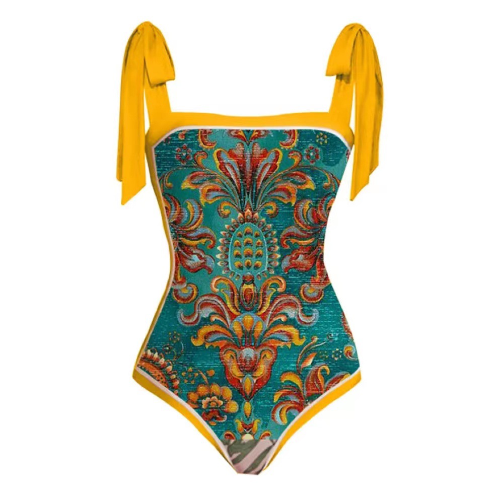 Two Piece Swimsuit Vintage Print Flab Hiding Slimming Sun Protective Beach Dress Swimsuit