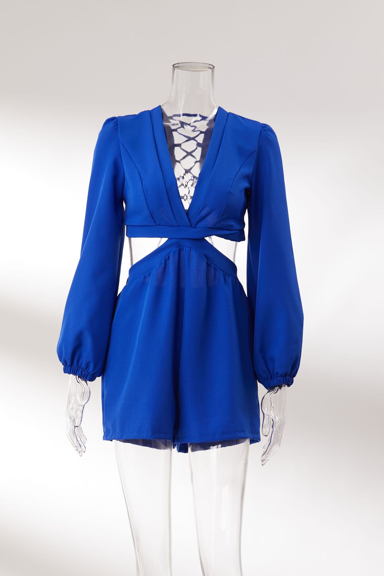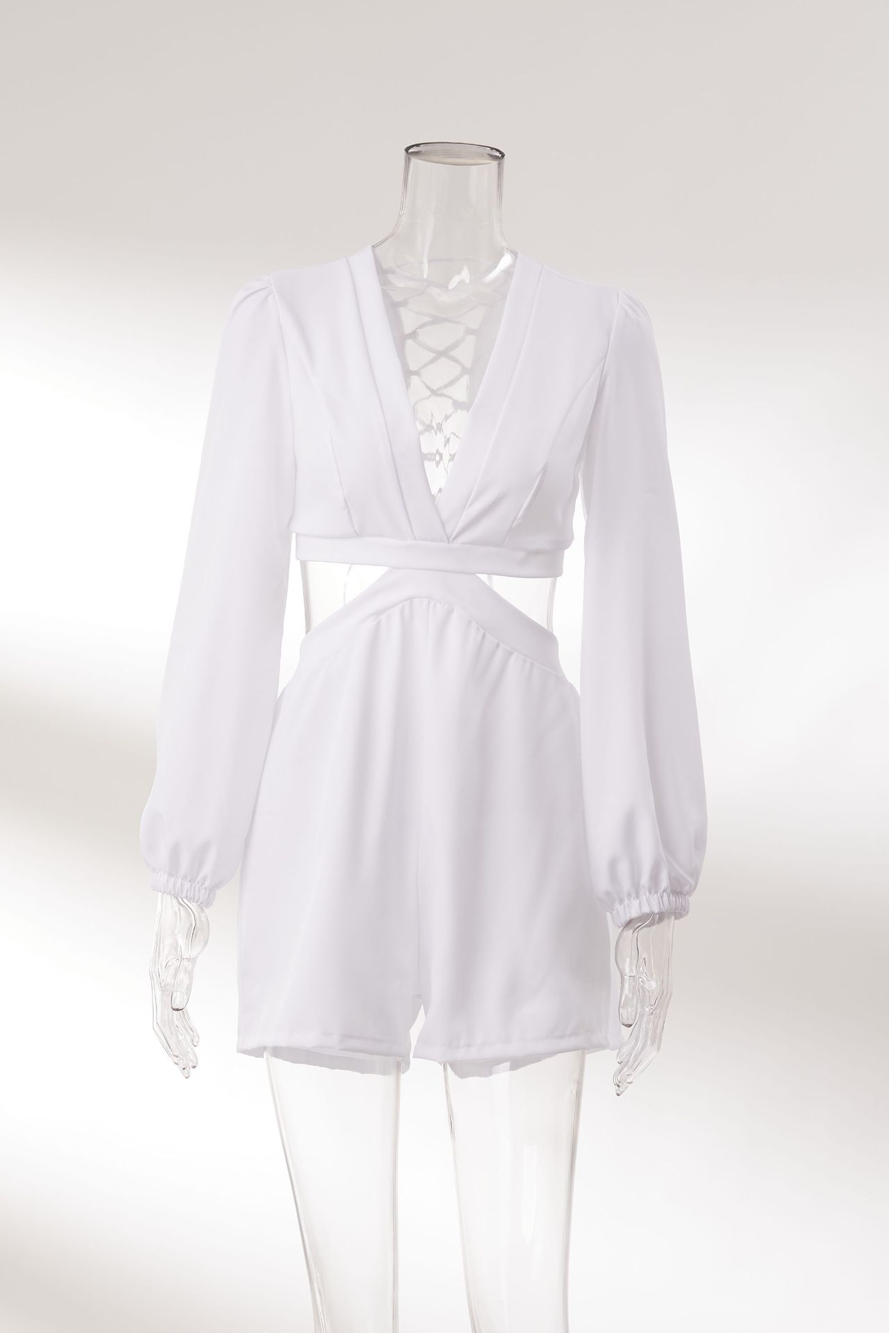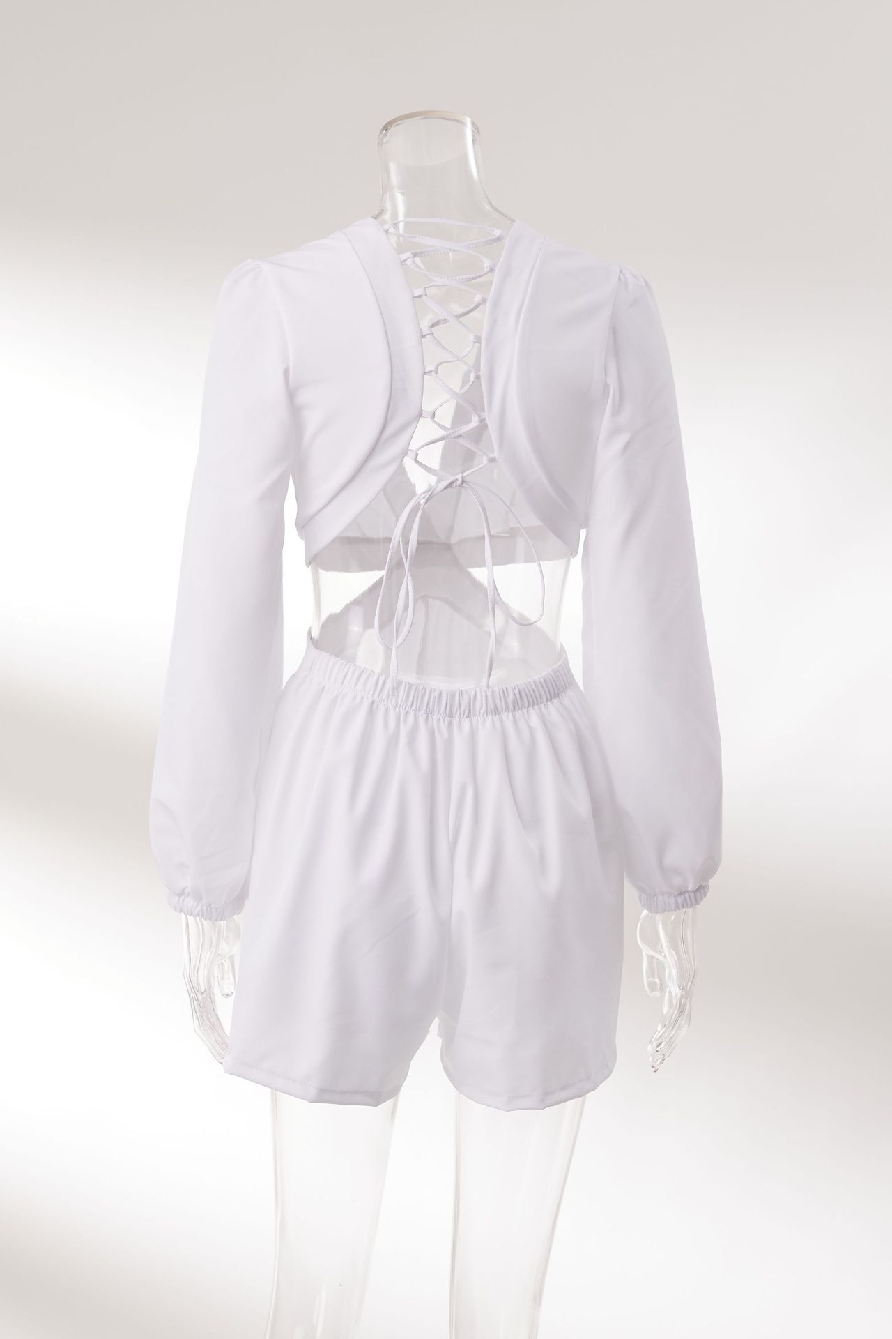 V neck Lace up Long Sleeved Jumpsuit Autumn Sexy Cutout Shorts