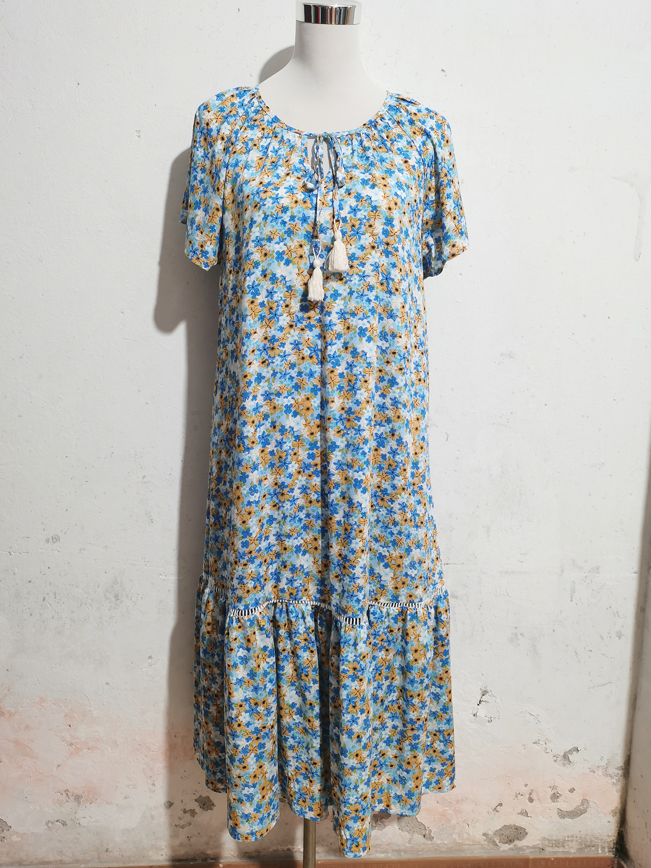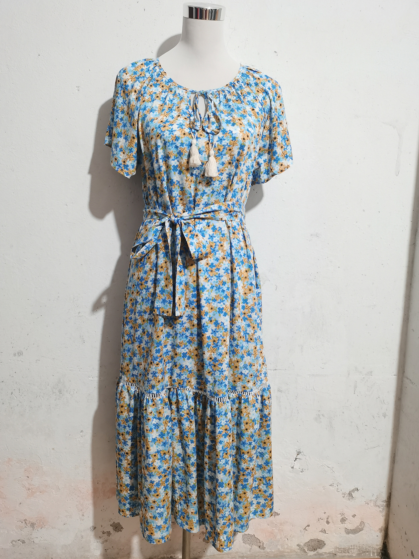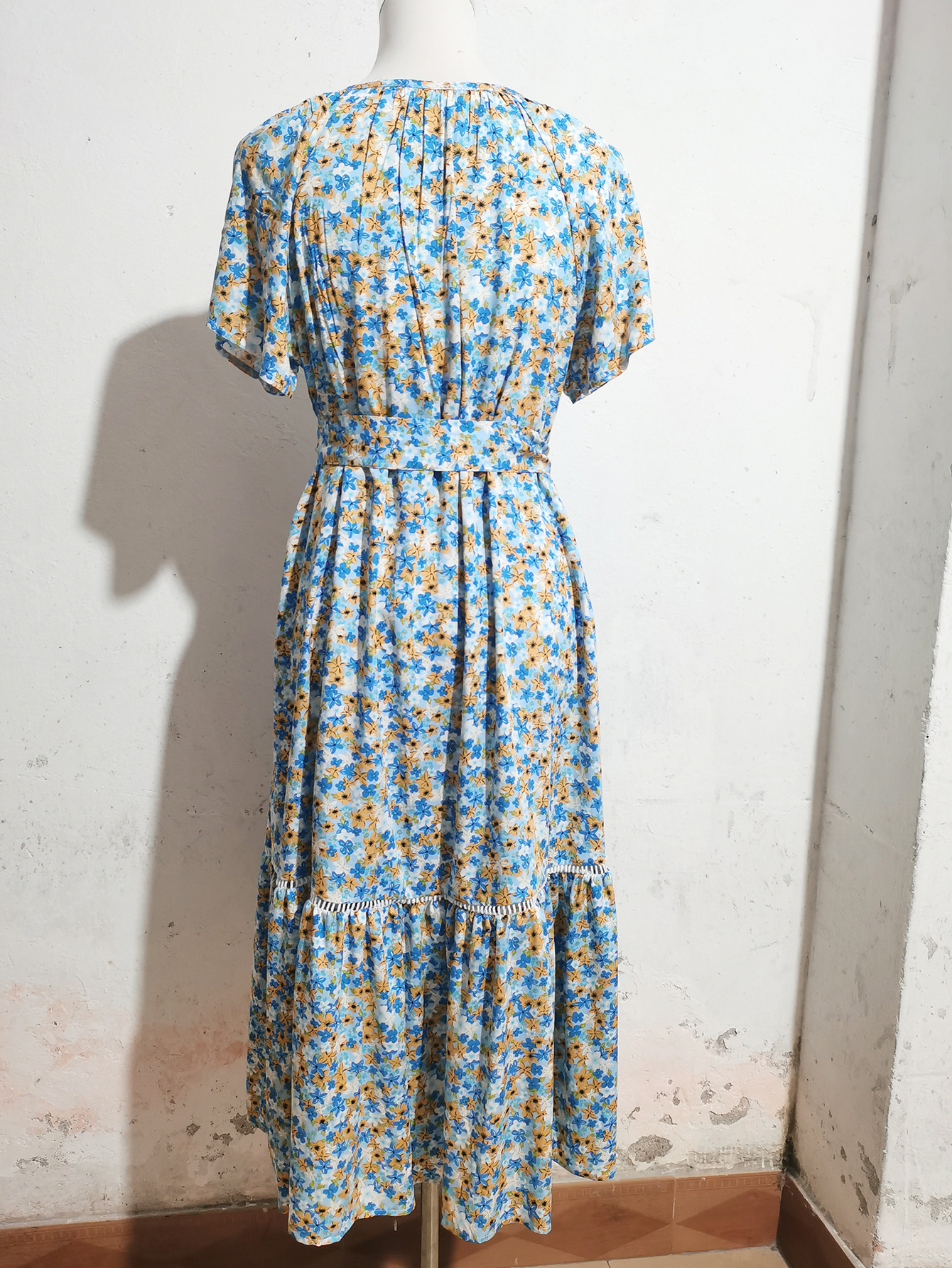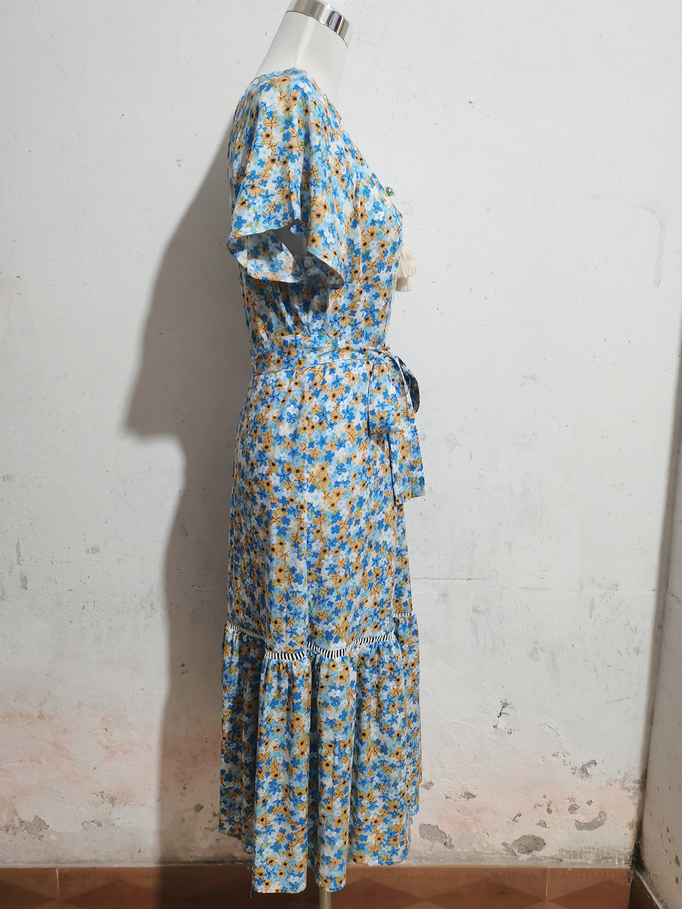 V neck Short Sleeve Hollow Out Cutout Lace Stitching Flounced Pastoral Vacation Dress
