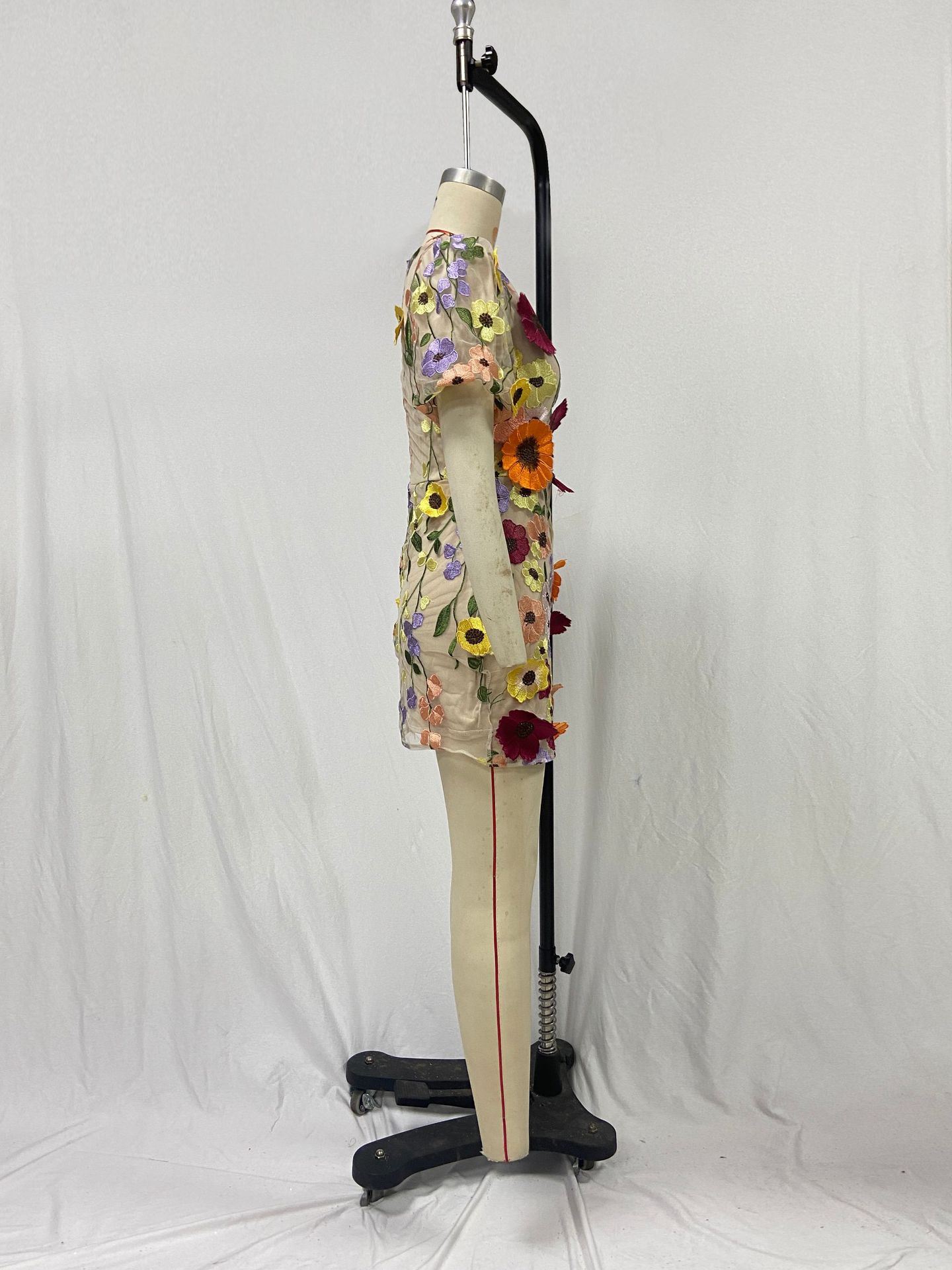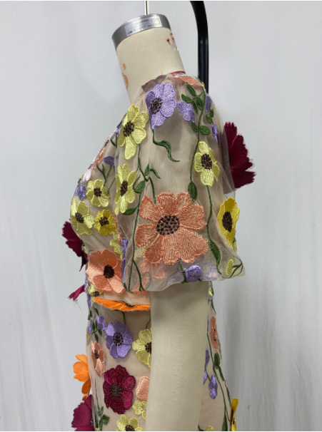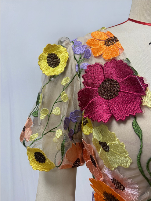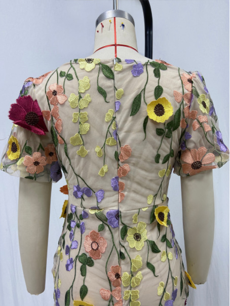 V neck Three Dimensional Floral Sheath Lantern Sleeve Dress Sexy Embroidered Dress