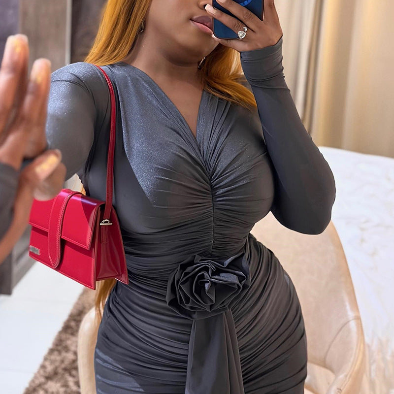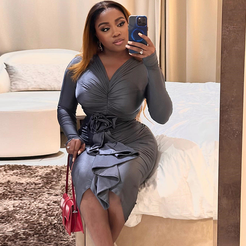 V neck Tight Dress Long Sleeve Mid Length Irregular Asymmetric Hip Wrapped Dress Three Dimensional Ornamental Floral Pullover