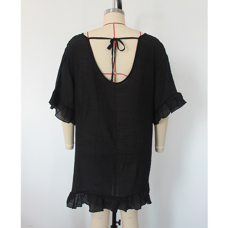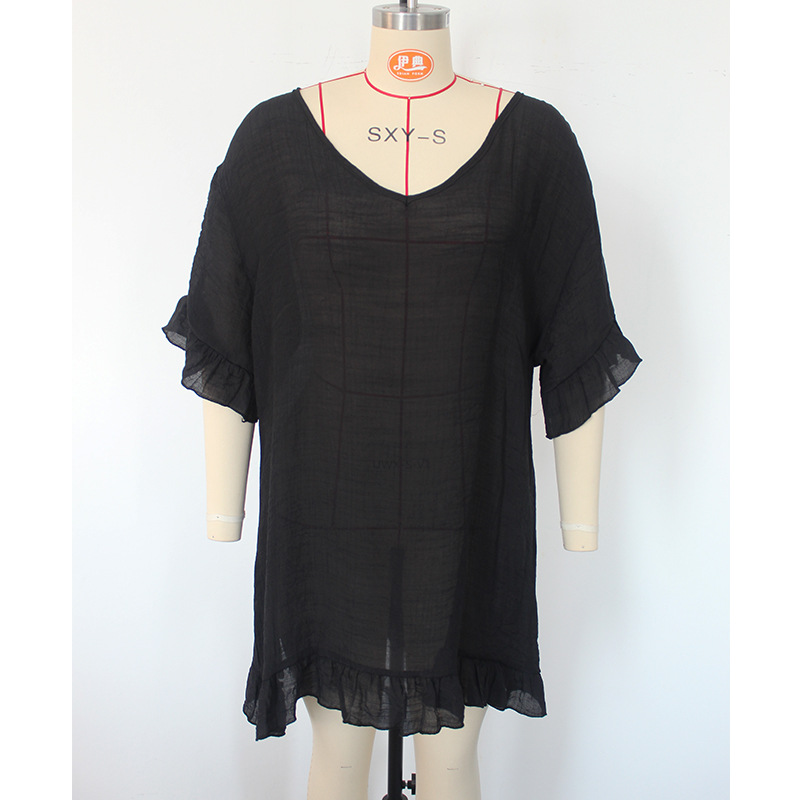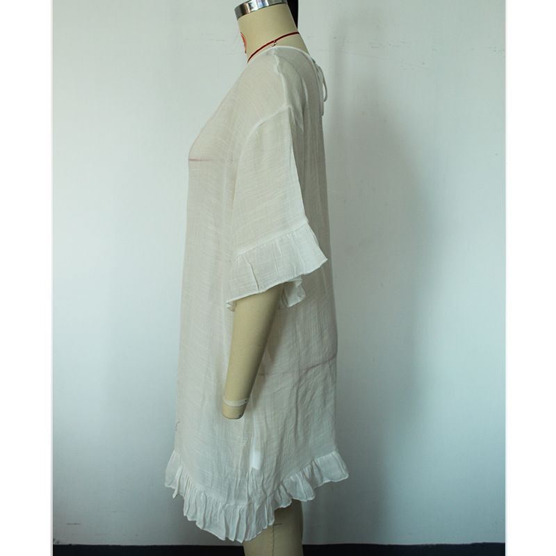 Vacation Beach Cover Up Solid Color Sun Protection Shirt Ruffled V Neck Bikini Loose Blouse