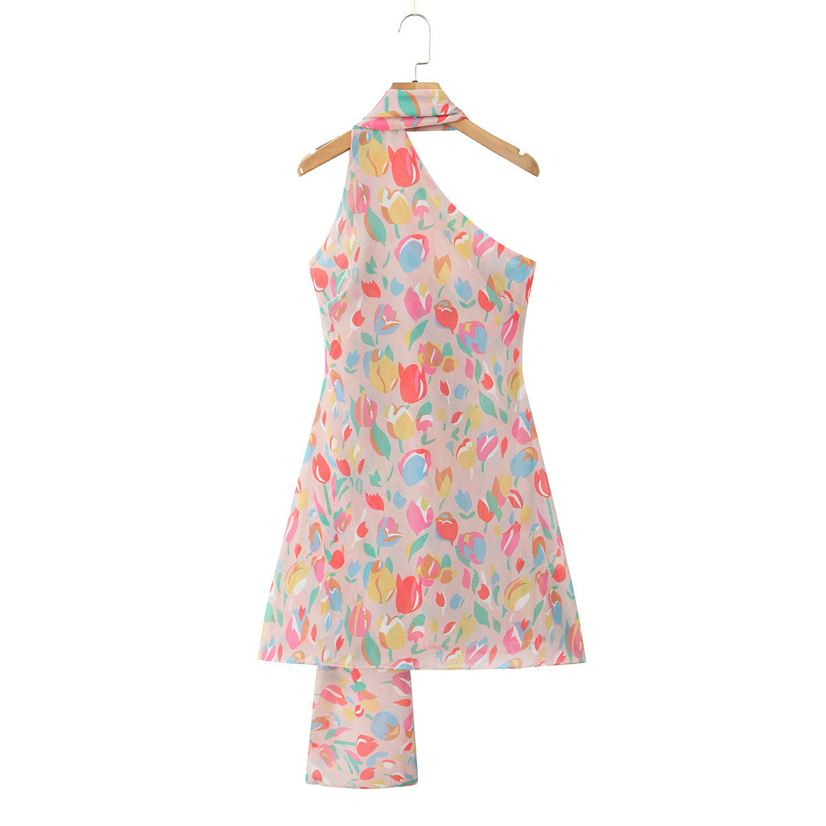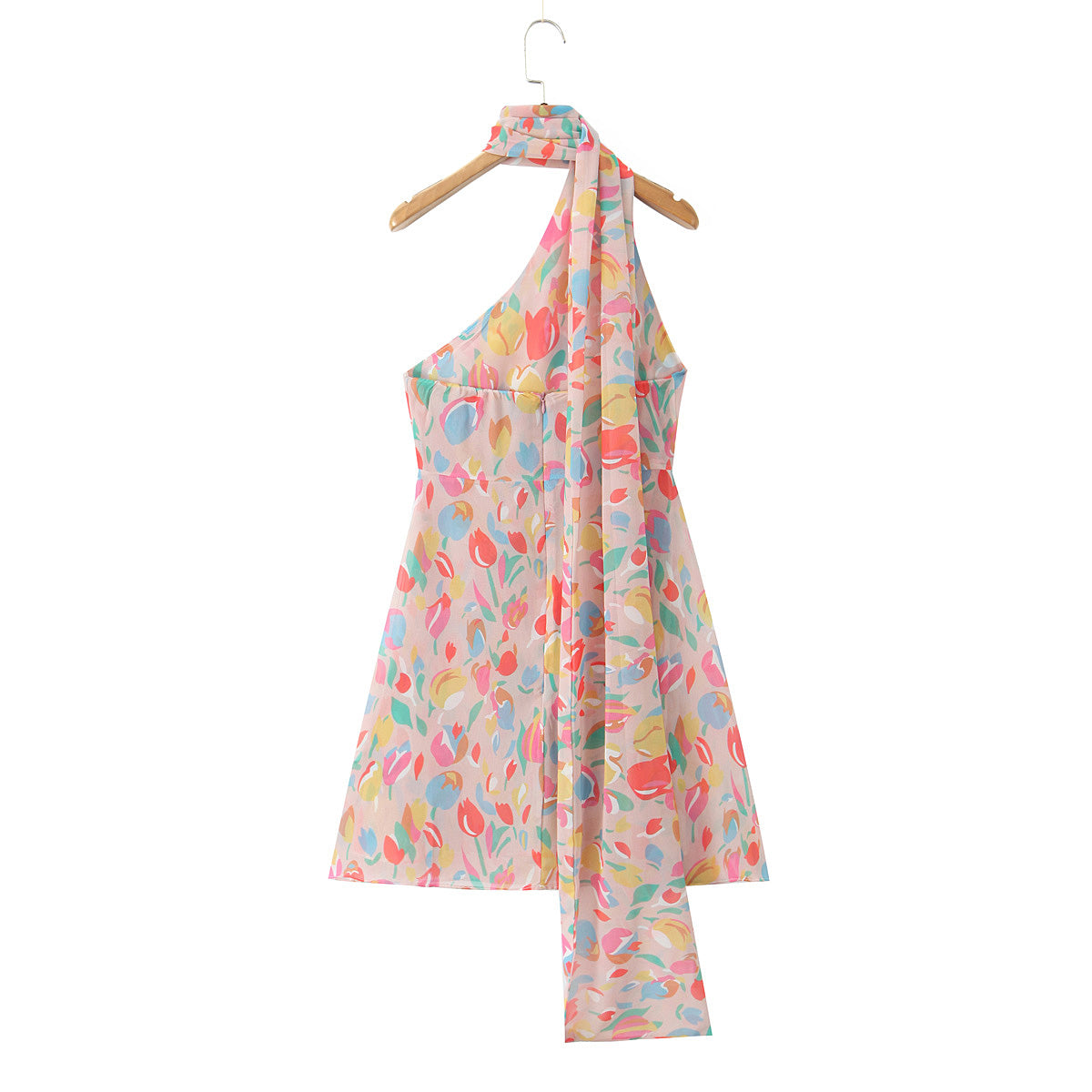 Winter Tulip Oil Color Printing Asymmetric Oblique Shoulder Vacation Casual Dress