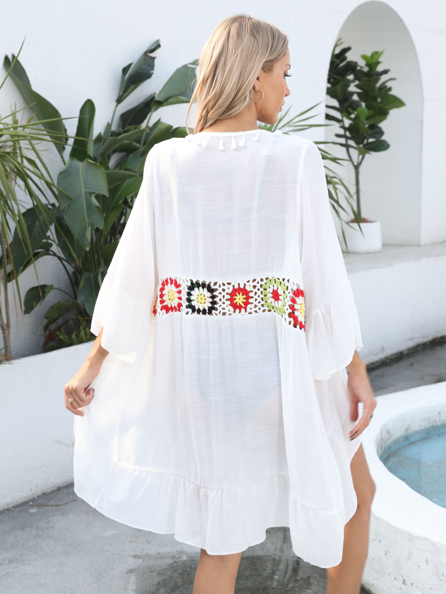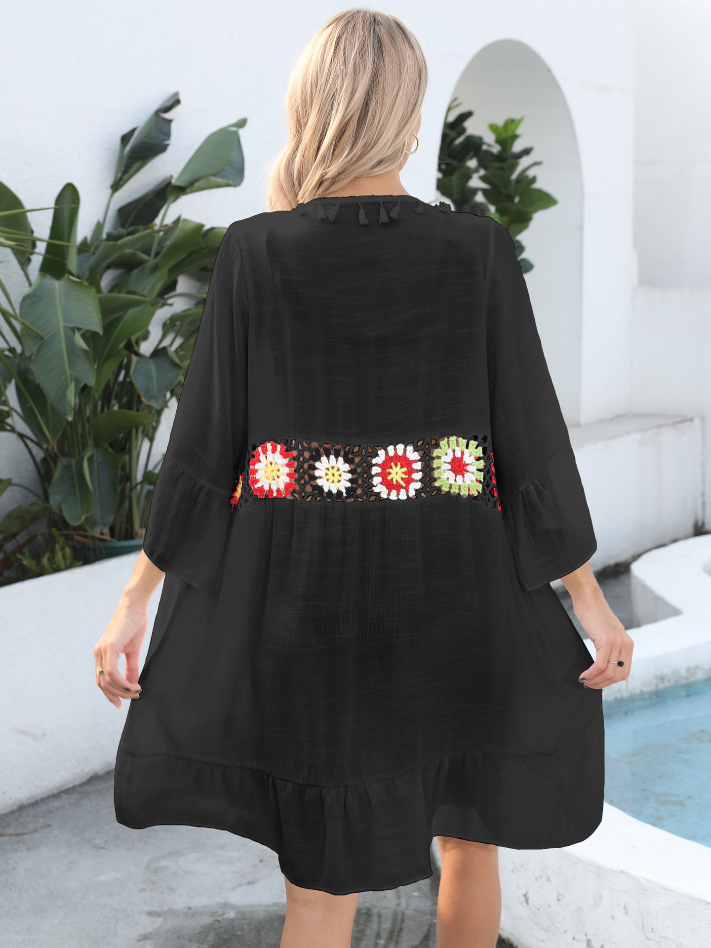 Women Beach Cover up Random Color Crochet Stitching Lace up Ruffled Sun Protection Coat