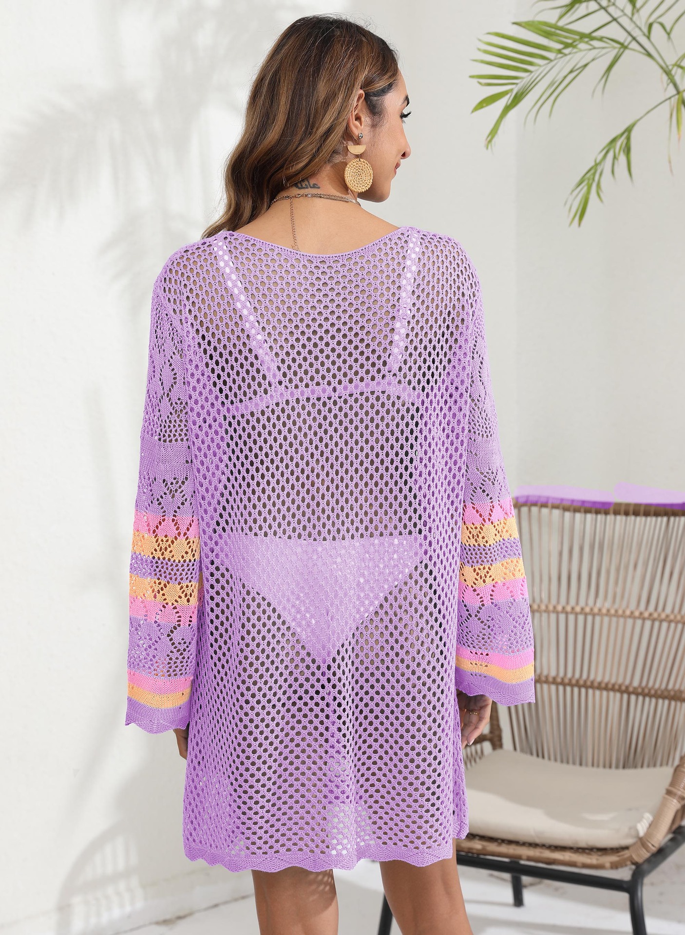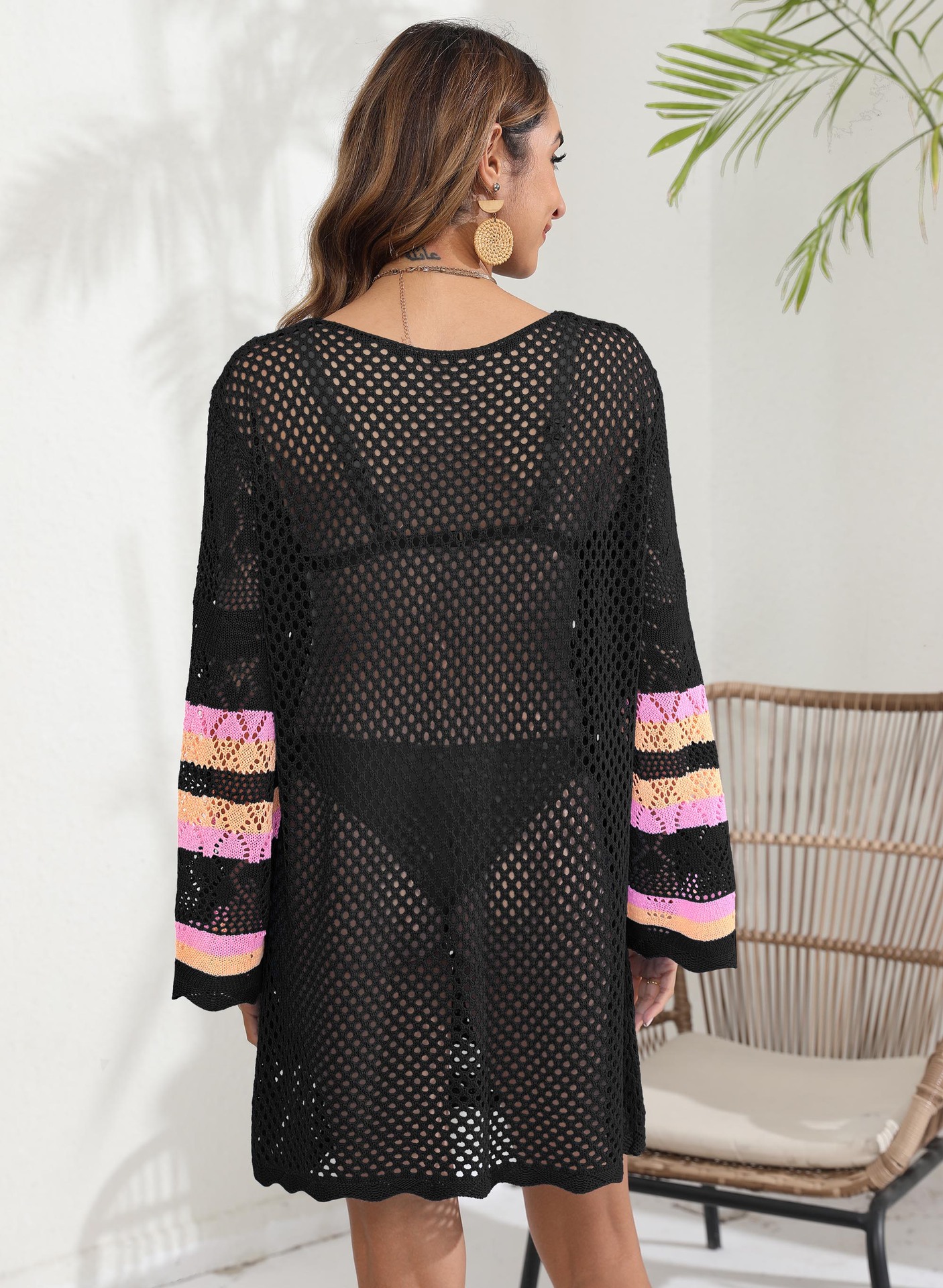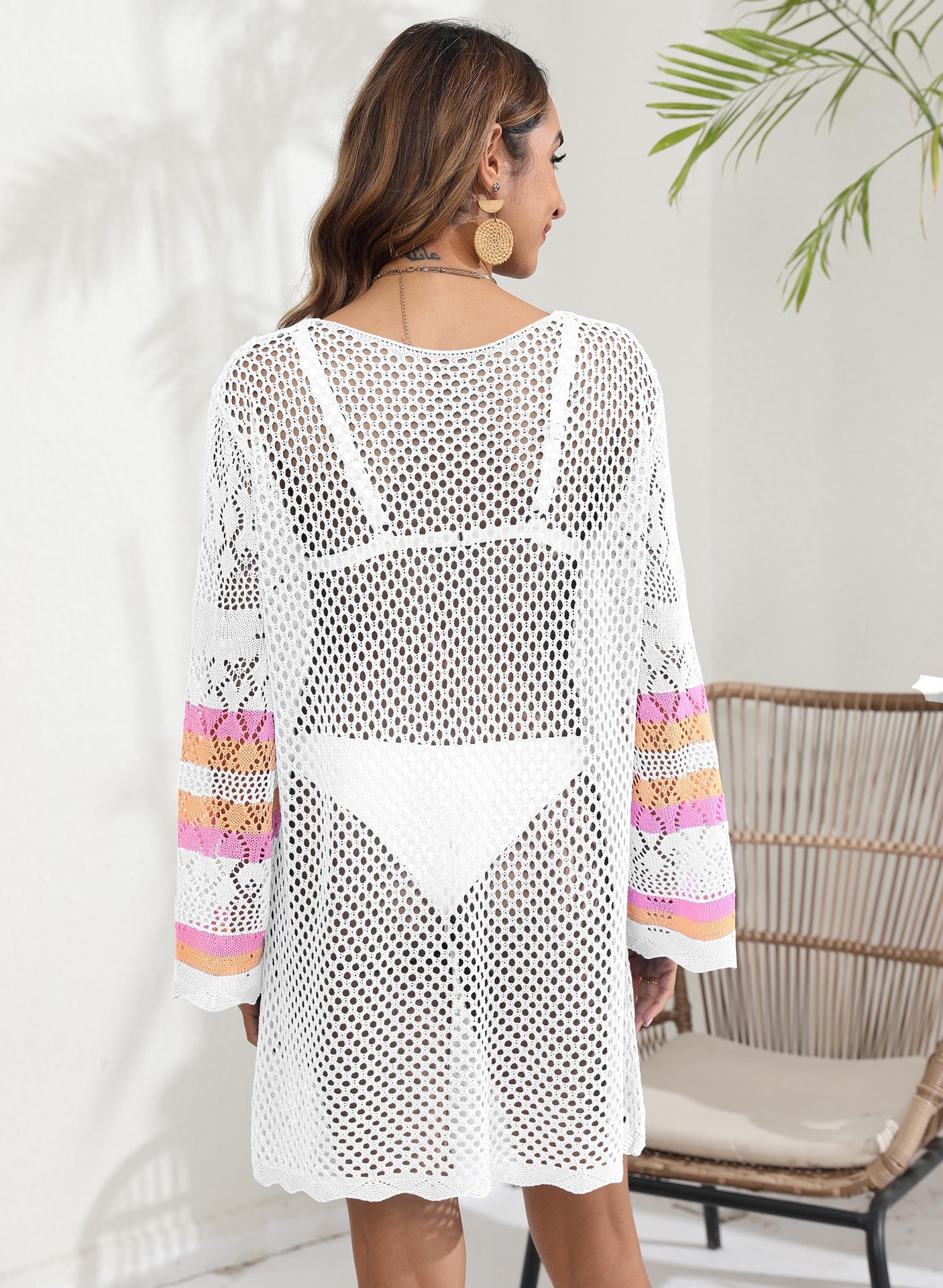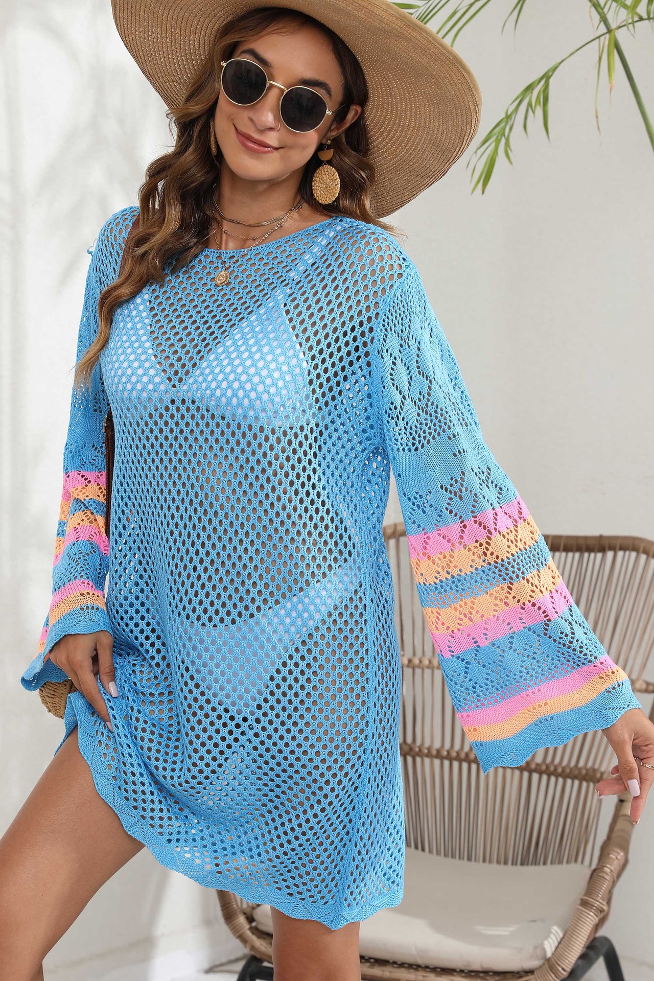 Women Beach Vacation Blouse Women's Clothing Color Contrast Patchwork Bikini Cover up Dress