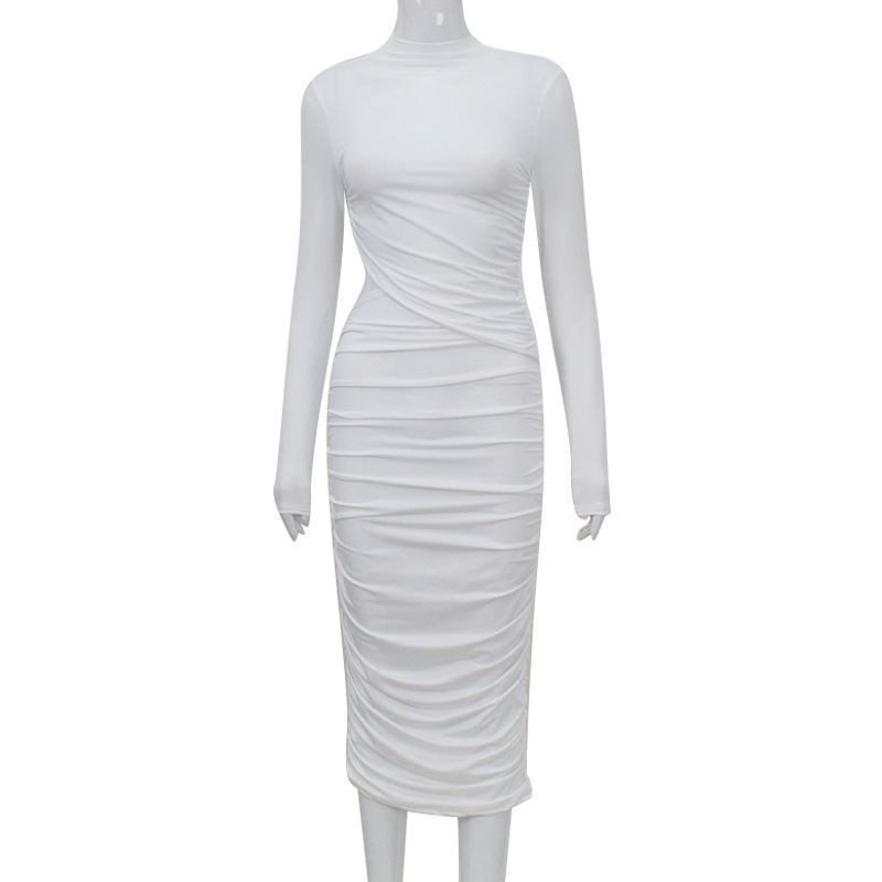 Women Clothing Autumn Crew Neck Long Sleeve Sexy Cutout Pleated Tight Elegant Sheath Dress Women