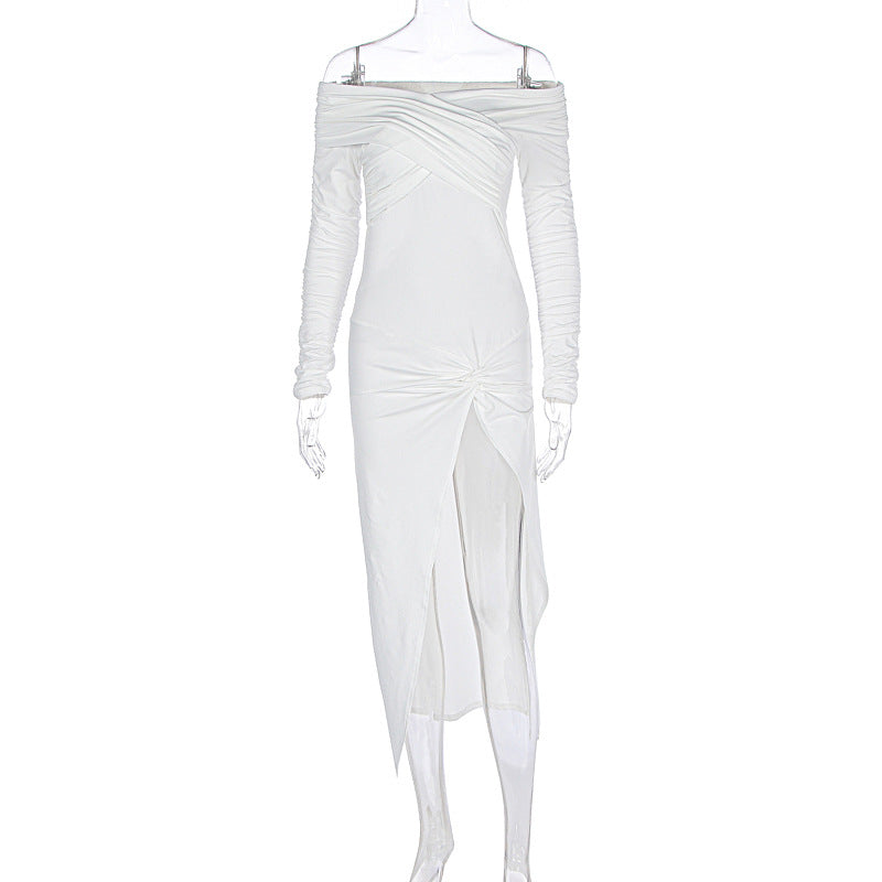 Women Clothing Autumn Solid Color off the Shoulder Tube Top Split Pleated Long Sleeve Dress