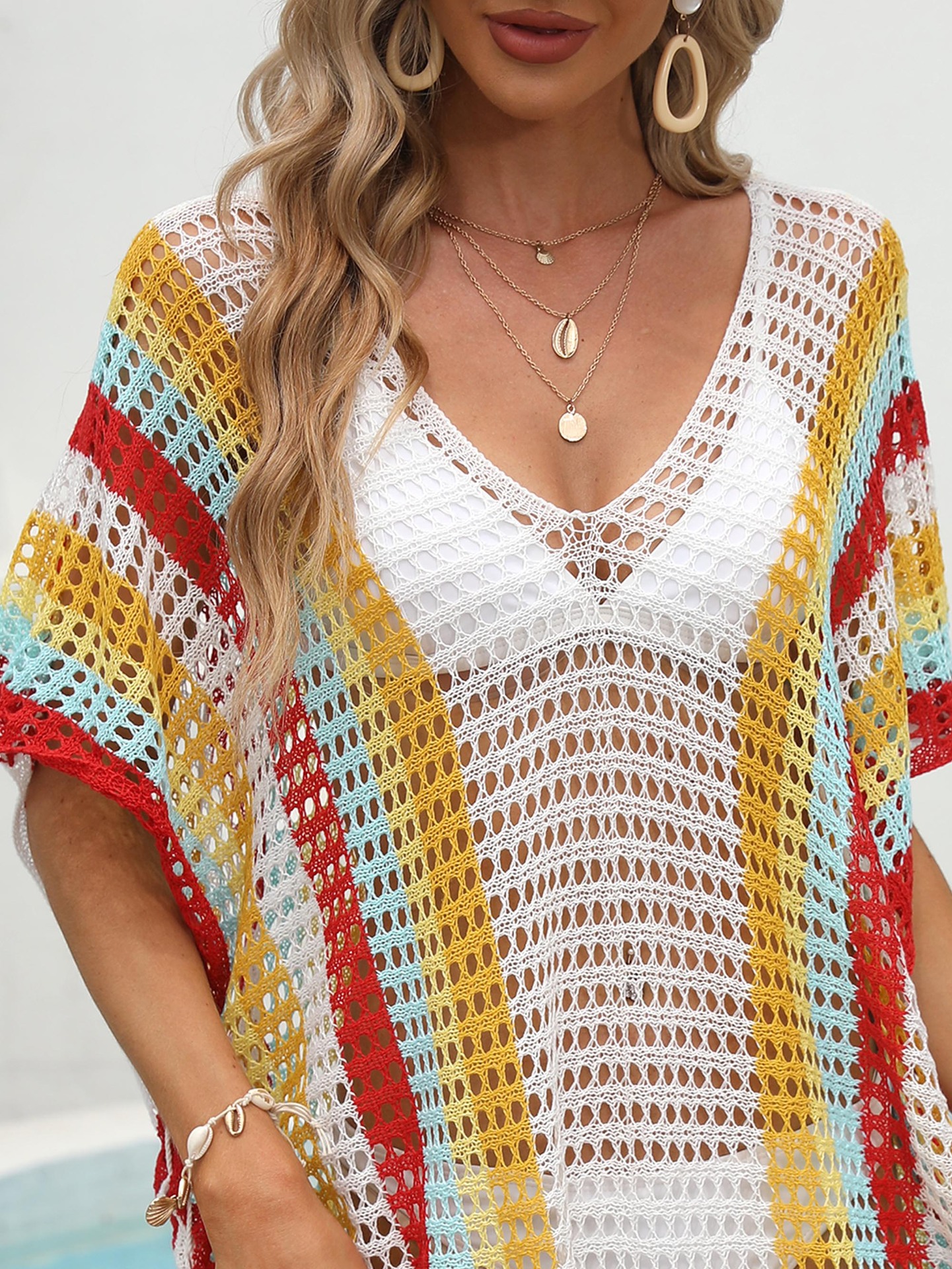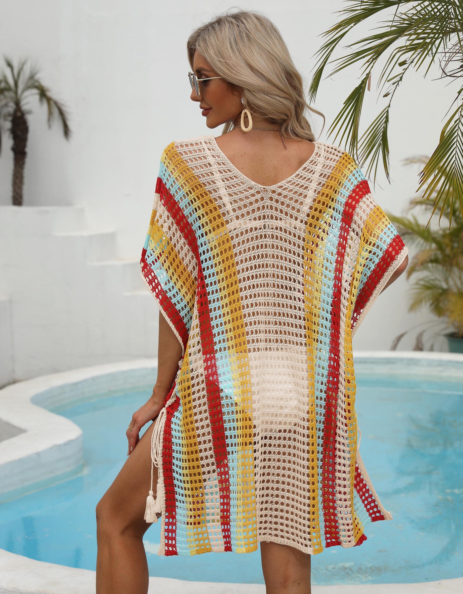 Women Clothing Color Contrast Patchwork Woven Hollow Out Cutout Beach Vacation Beach Cover Up Lace Up Dress