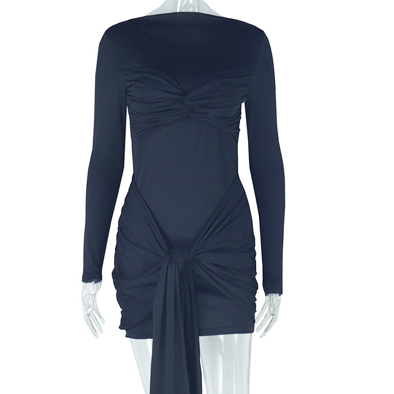 Women Clothing Elegant Stitching Solid Color Tied Bag Hip Long Sleeve round Neck High Waist Short Dress