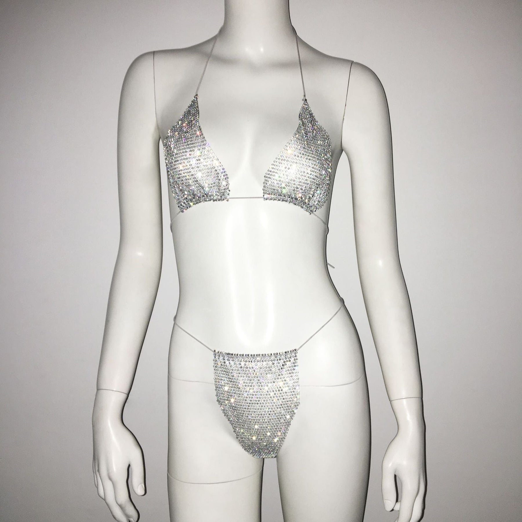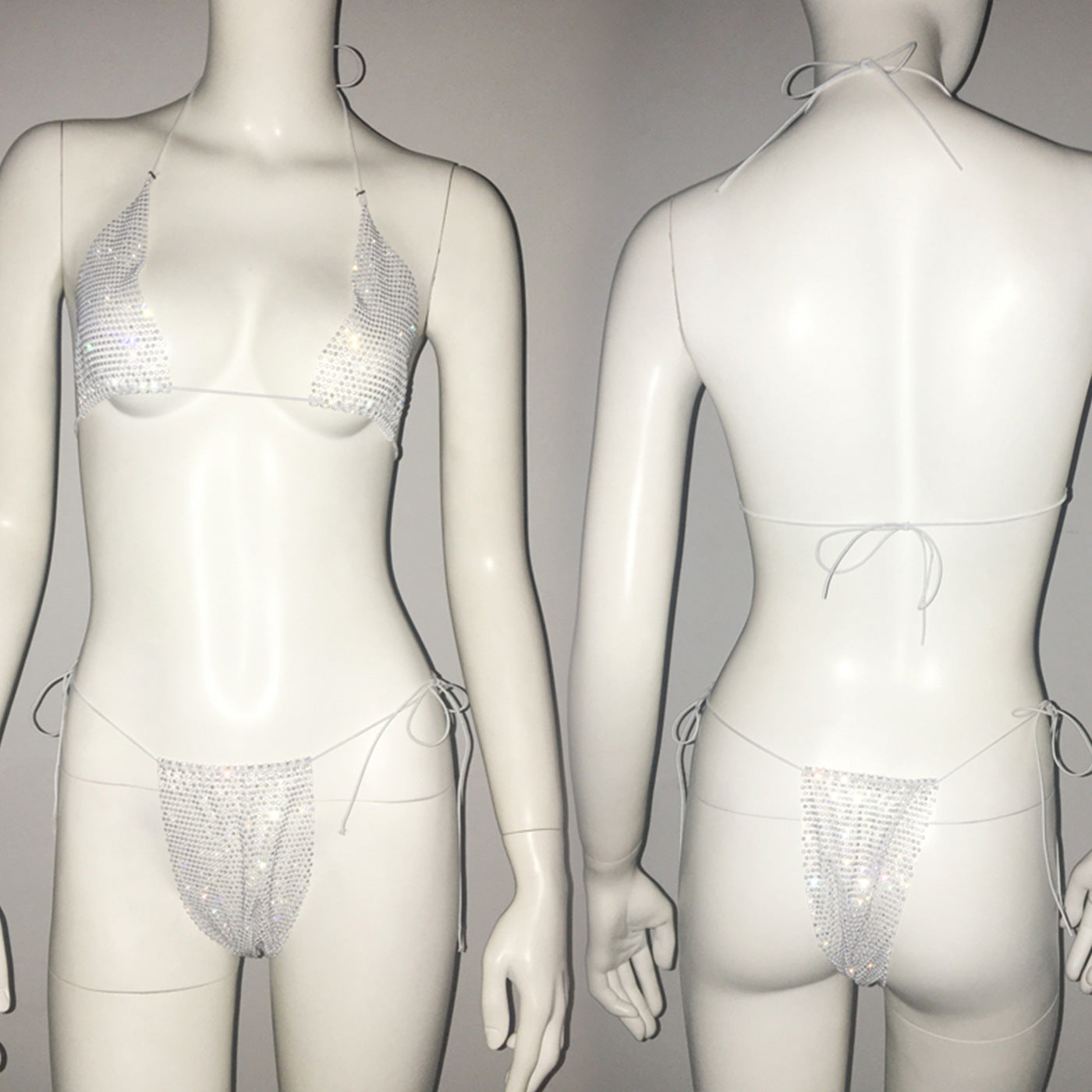Women Clothing Rhinestone Bikini Set Carnival Sexy Lace Up Outdoor Beach Split Swimsuit