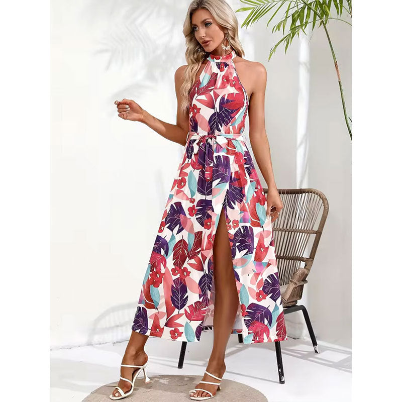 Women Clothing Romantic Holiday Print Halter Split Maxi Dress Spring Women Mid Length