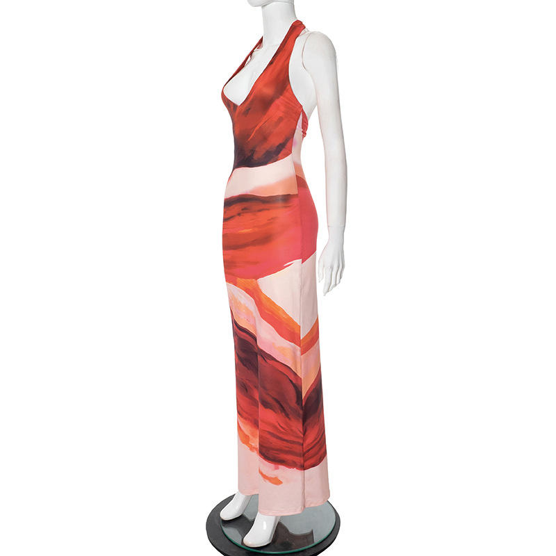 Women Clothing Spring Summer Floral Print Halter Strap Slit Length Dress