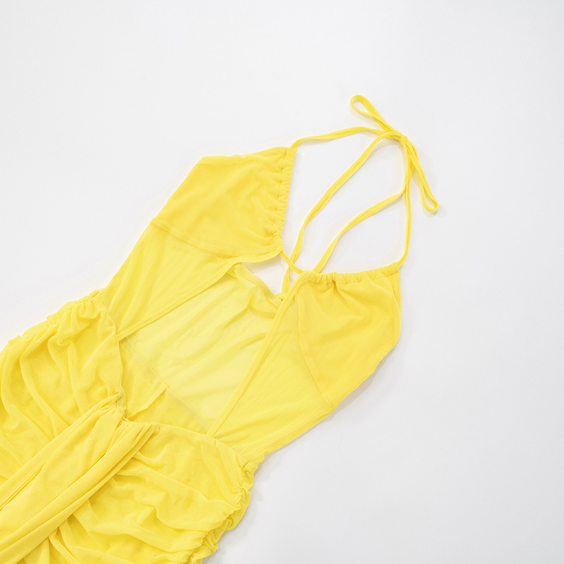 Women Clothing Spring Summer Halter Cropped Outfit Mesh Drawstring Sheer Cutout Ribbon Jumpsuit