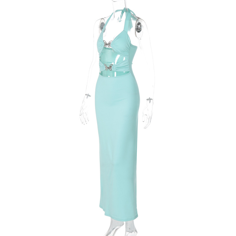 Women Clothing Summer Metal Butterfly Sexy Cutout Halter Dress