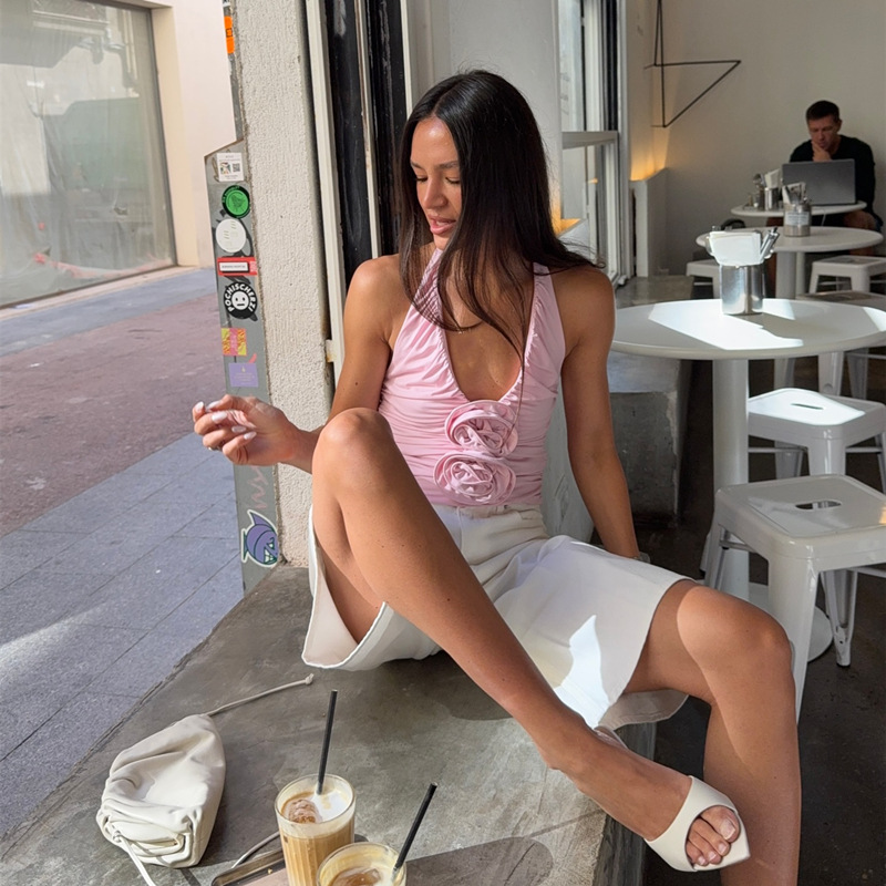 Women Clothing Summer Sexy Pure Want Pleated Floral Decoration Halterneck Vest Top