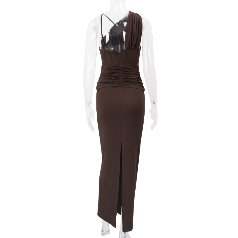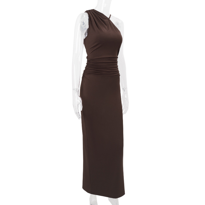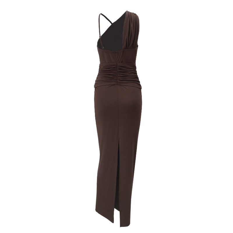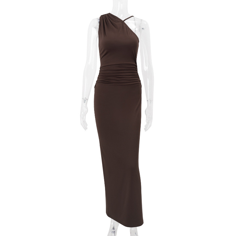 Women Clothing Summer Sexy Slant Shoulder High Waist Slim Fit Slimming Solid Color Sheath Dress
