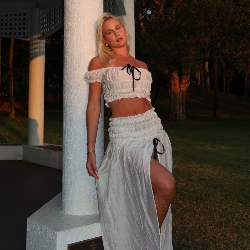 Women Clothing Summer Sexy Vacation off Neck Pleated Top Split Skirt Set