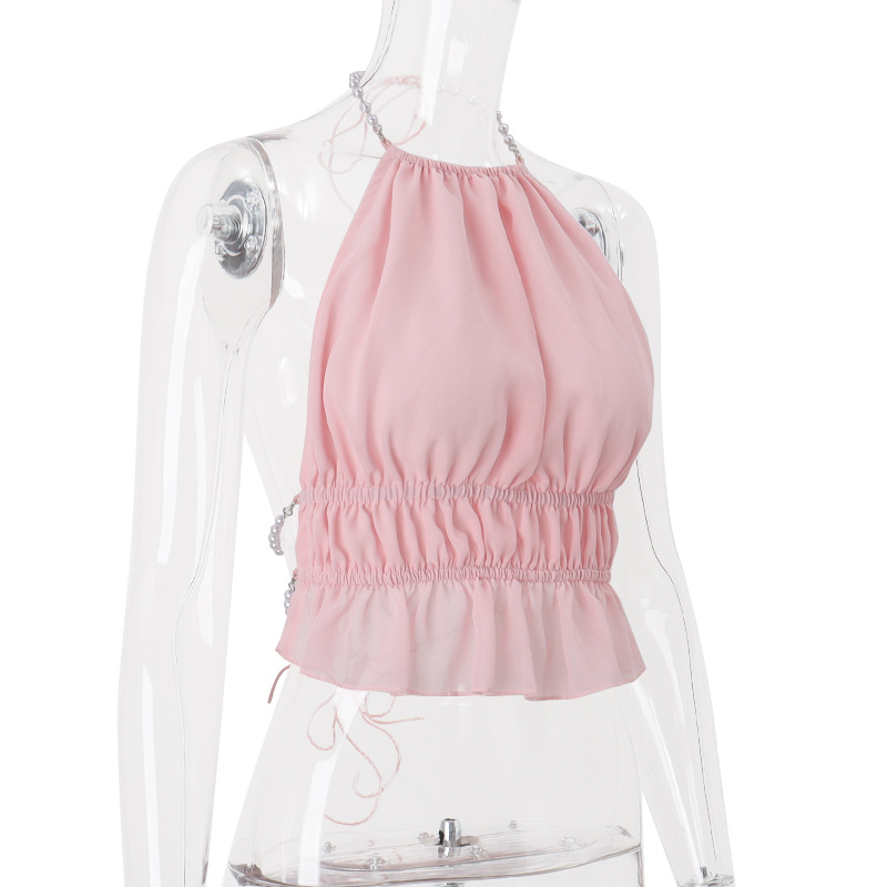 Women Clothing Summer Street Sexy Sexy Cutout Pleated Solid Color Halter Vest Top