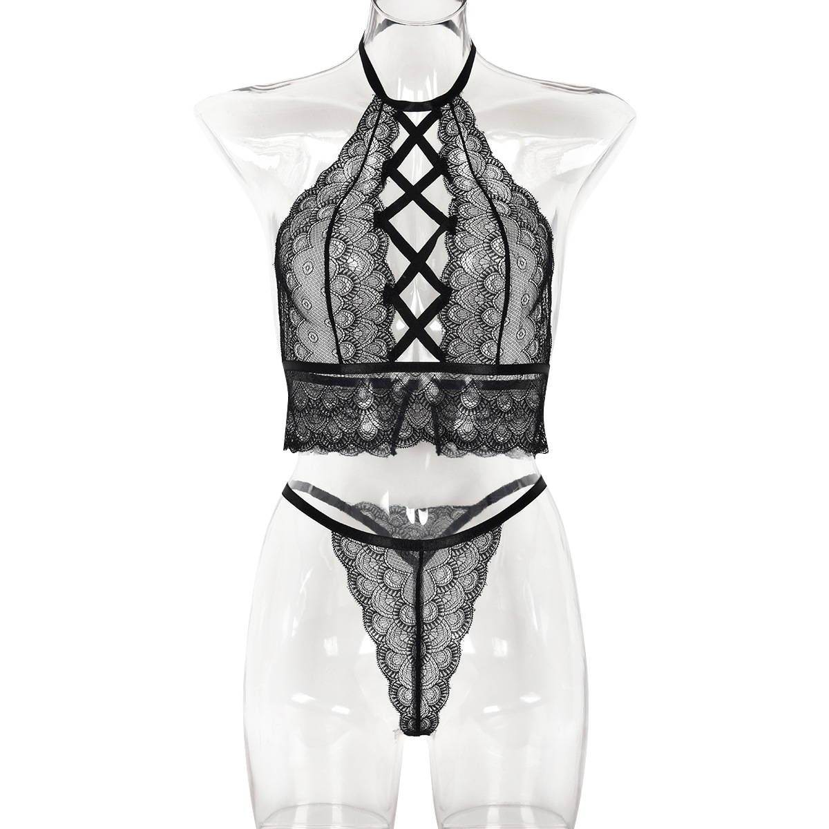 Women Clothing Thin Lace Sexy Cross Hollow Out Cutout Sexy Two Piece Set