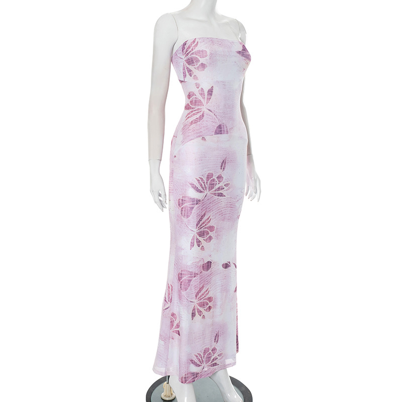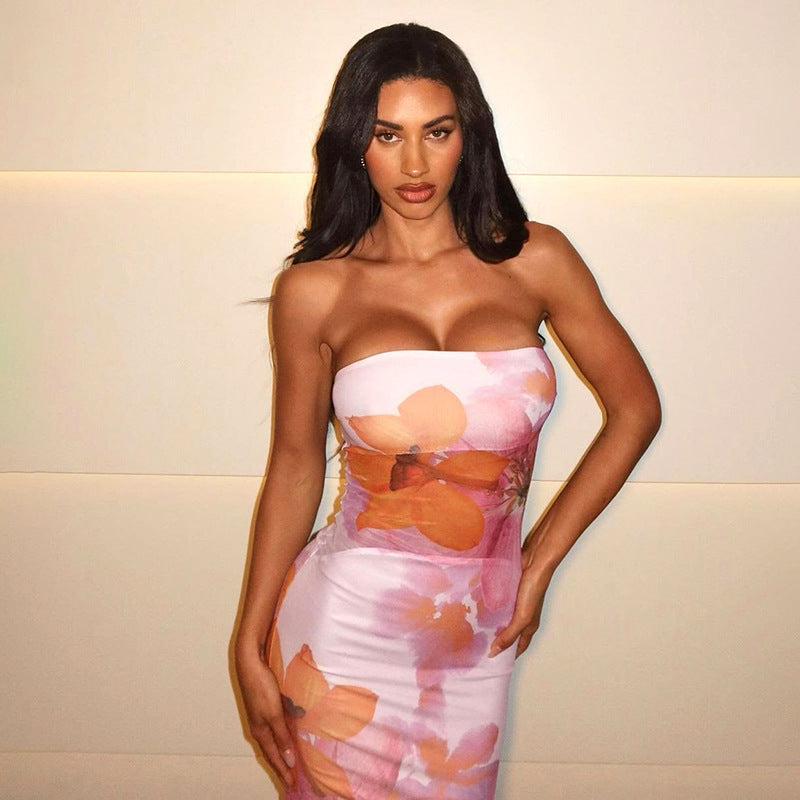 Women Clothing Tube Top Backless Floral Print Stitching Lining Sheath Dress