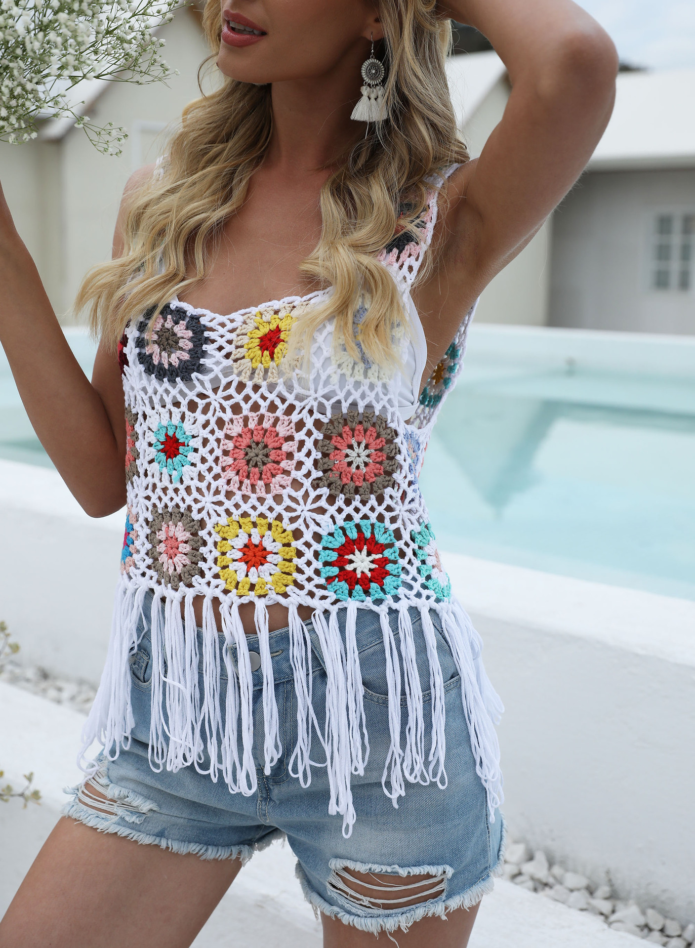 Women Clothing Women Top Pure Hand Crocheting Mixed Color Non-Positioning Floral Block Tassel Stitching Vest Top