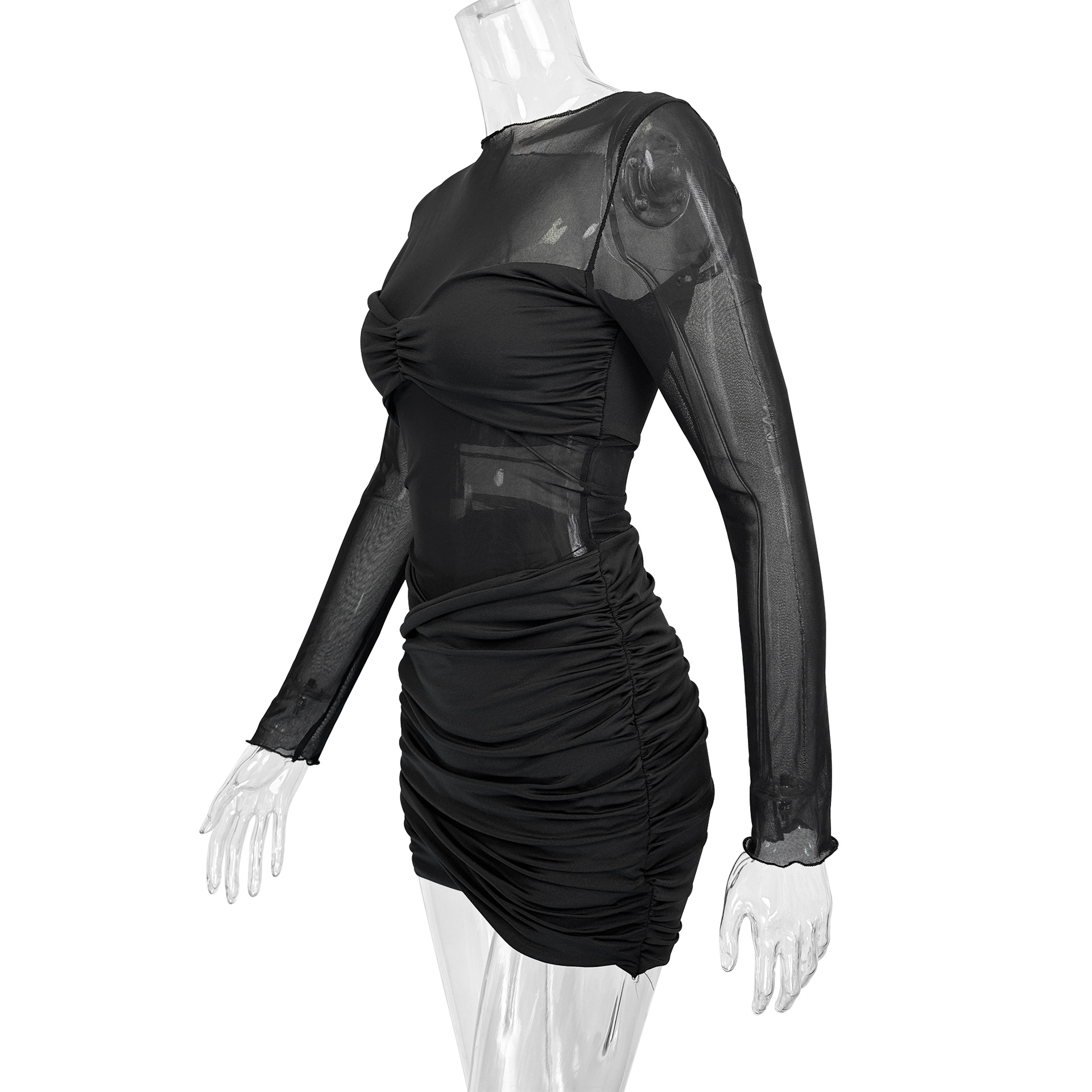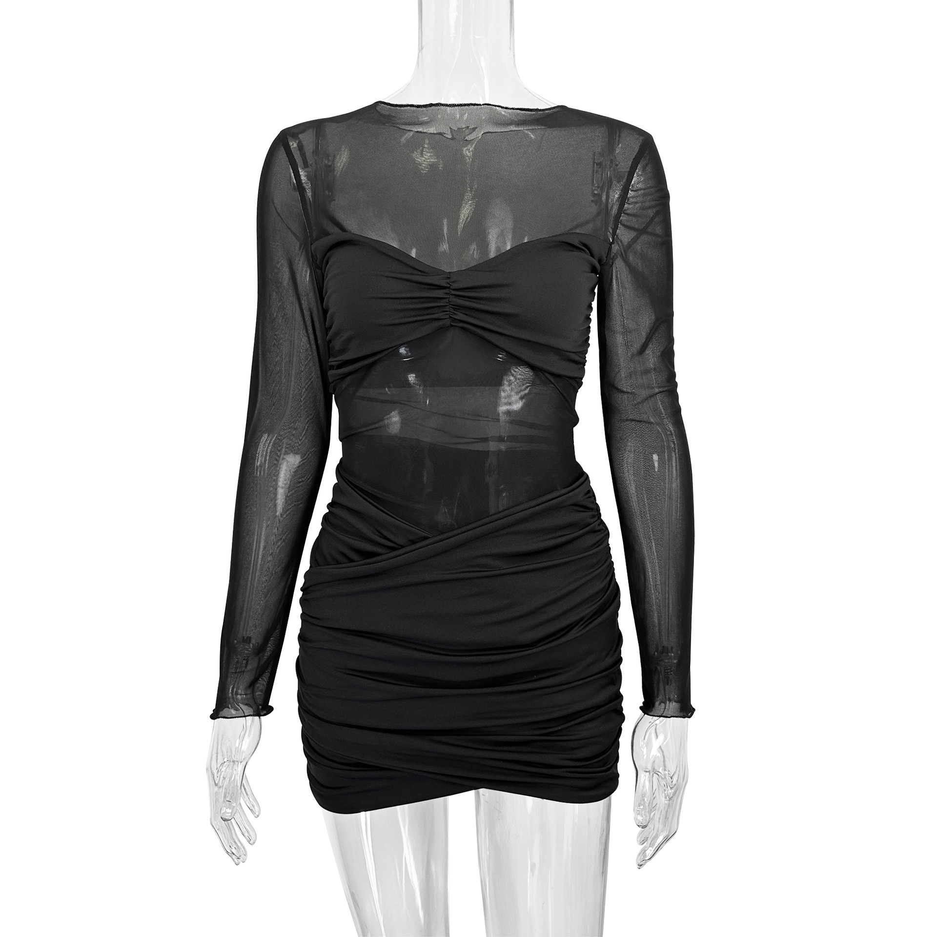 Women round Neck Long Sleeve Mesh Splicing Sexy Pleated Hip Bag Dress