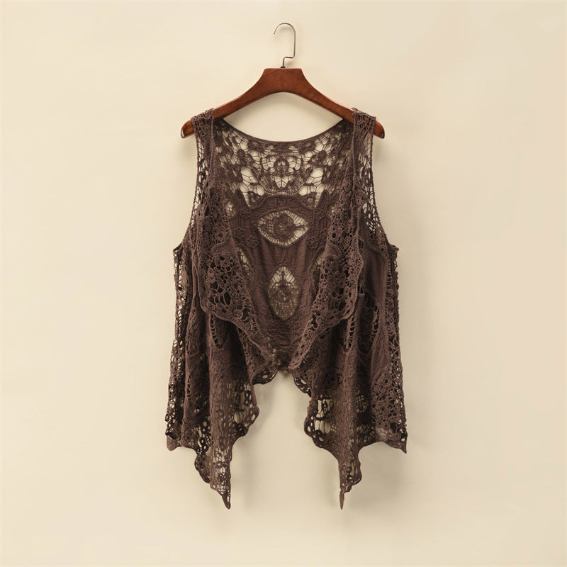 Women Summer Coat Thin Coat Sleeveless Lace Cardigan All Match Shawl Beachwear Sun Protection Clothing Women Hollow Out Cutout Shirt
