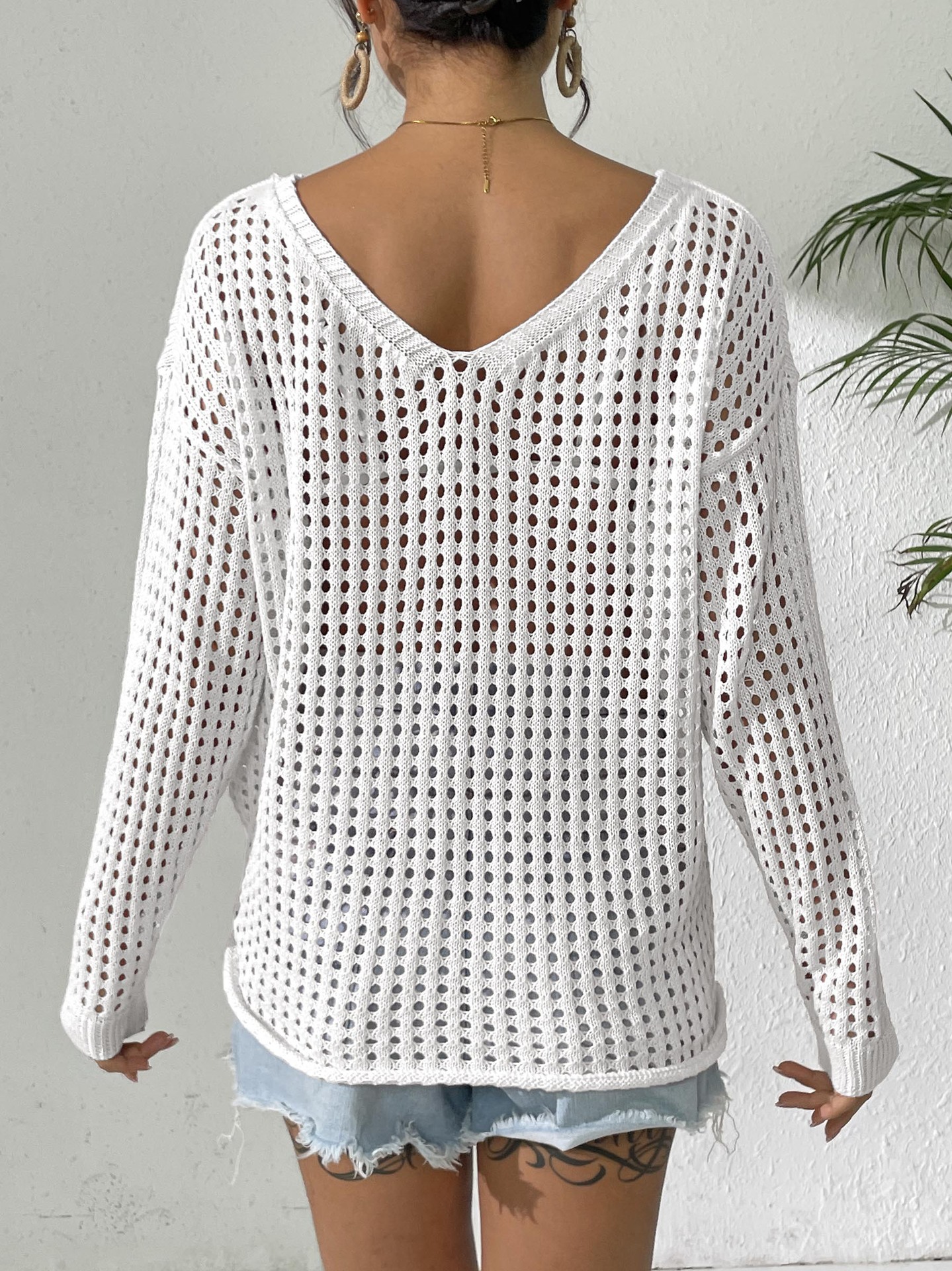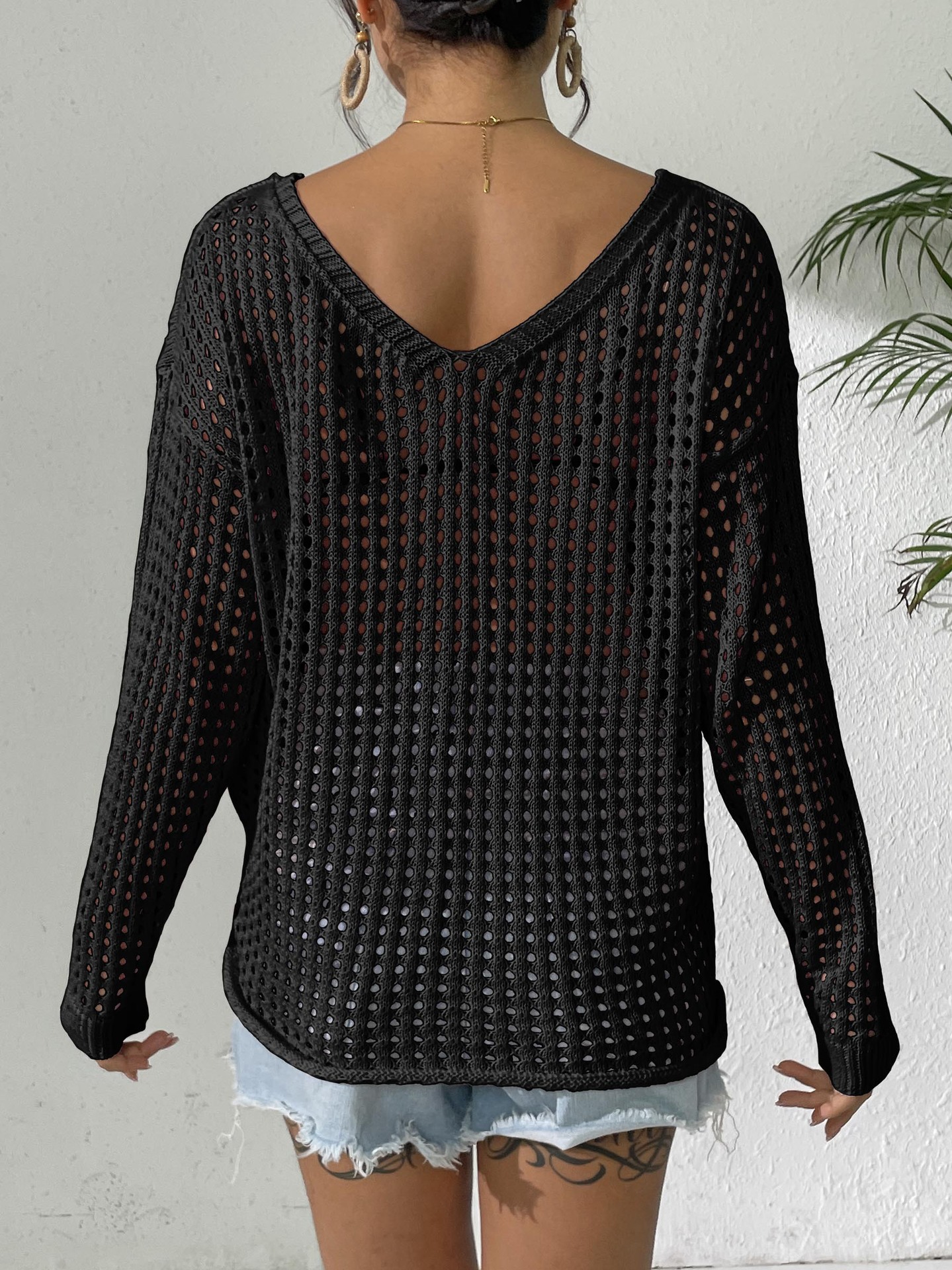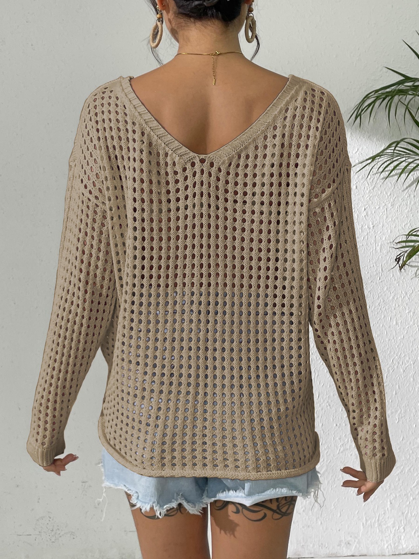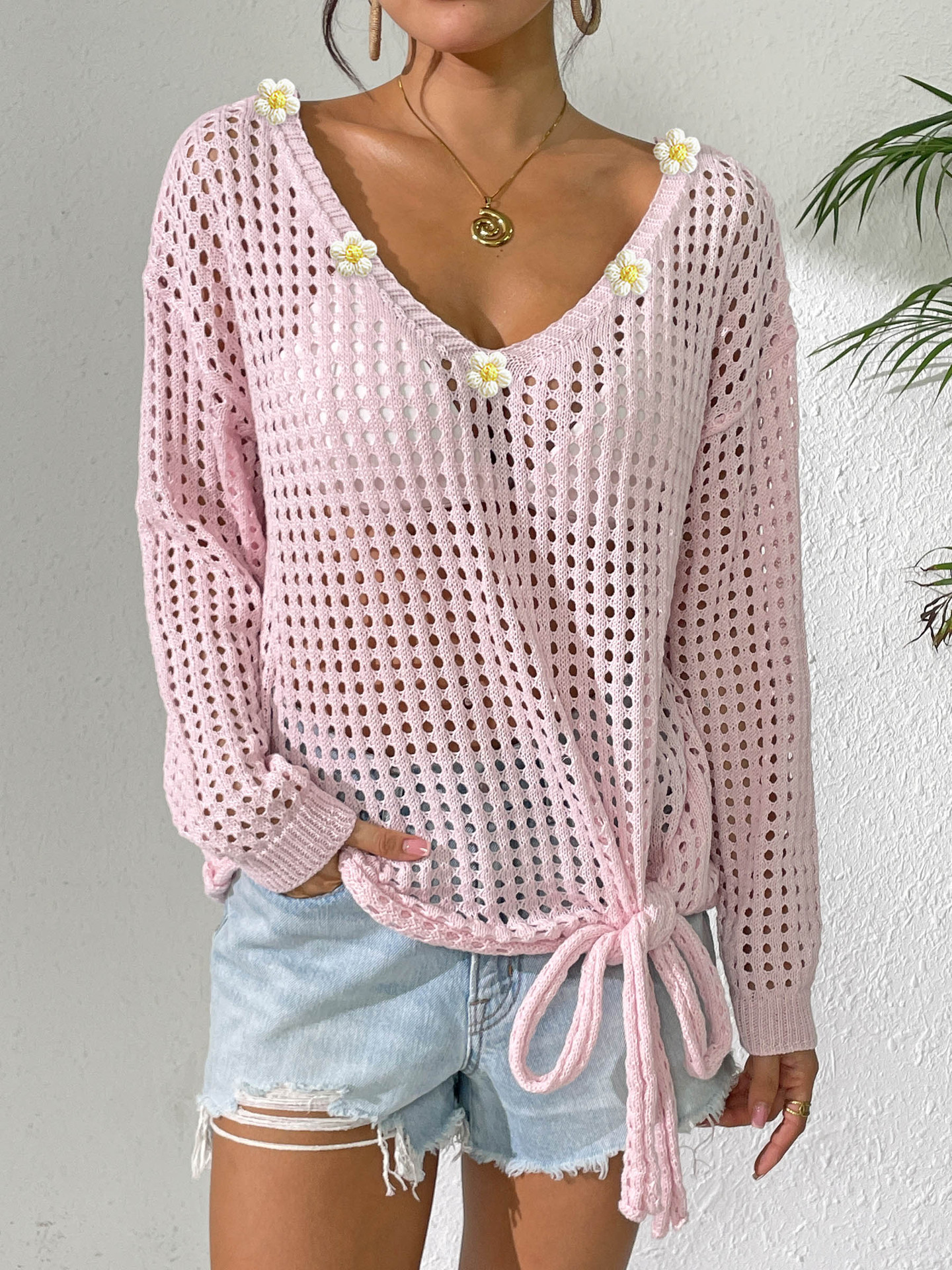 Women V neck Pullover Top Cutout Blouse Lace up Bow Outerwear Shirt Crochet Stitching Loose Sweater Women