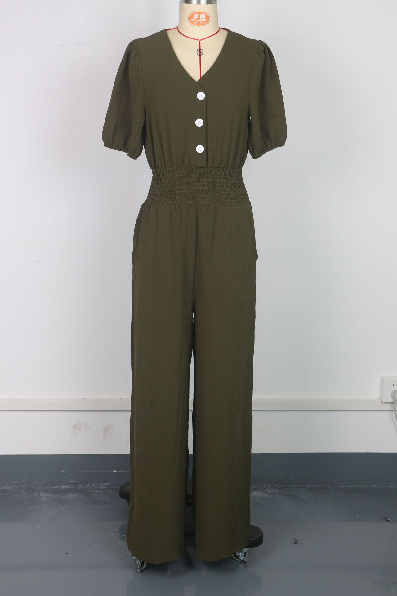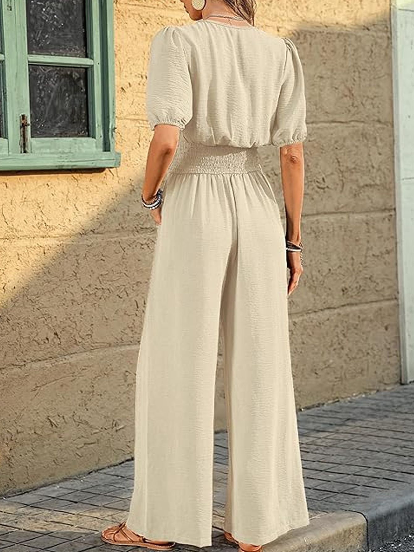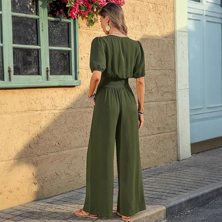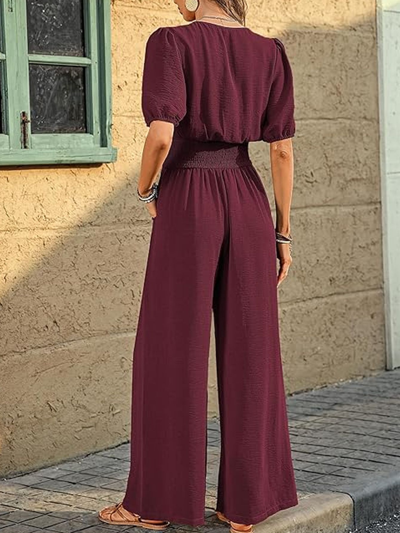 Women Wear Elegant Short Sleeve Collared Waist Tight Jumpsuit Wide Leg Loose Jumpsuit