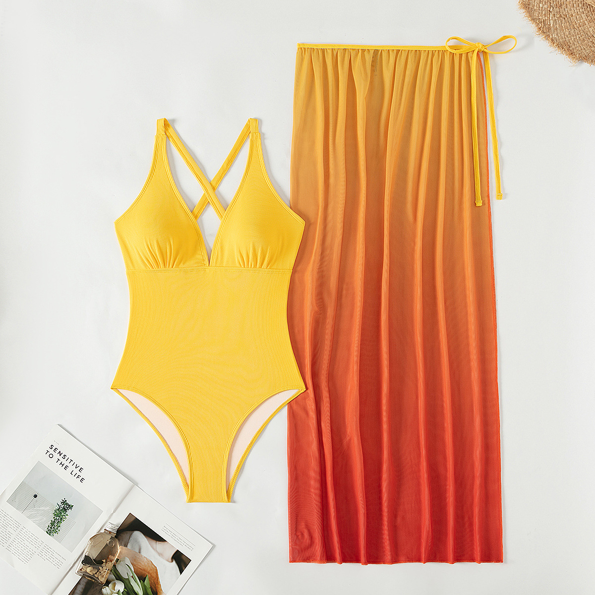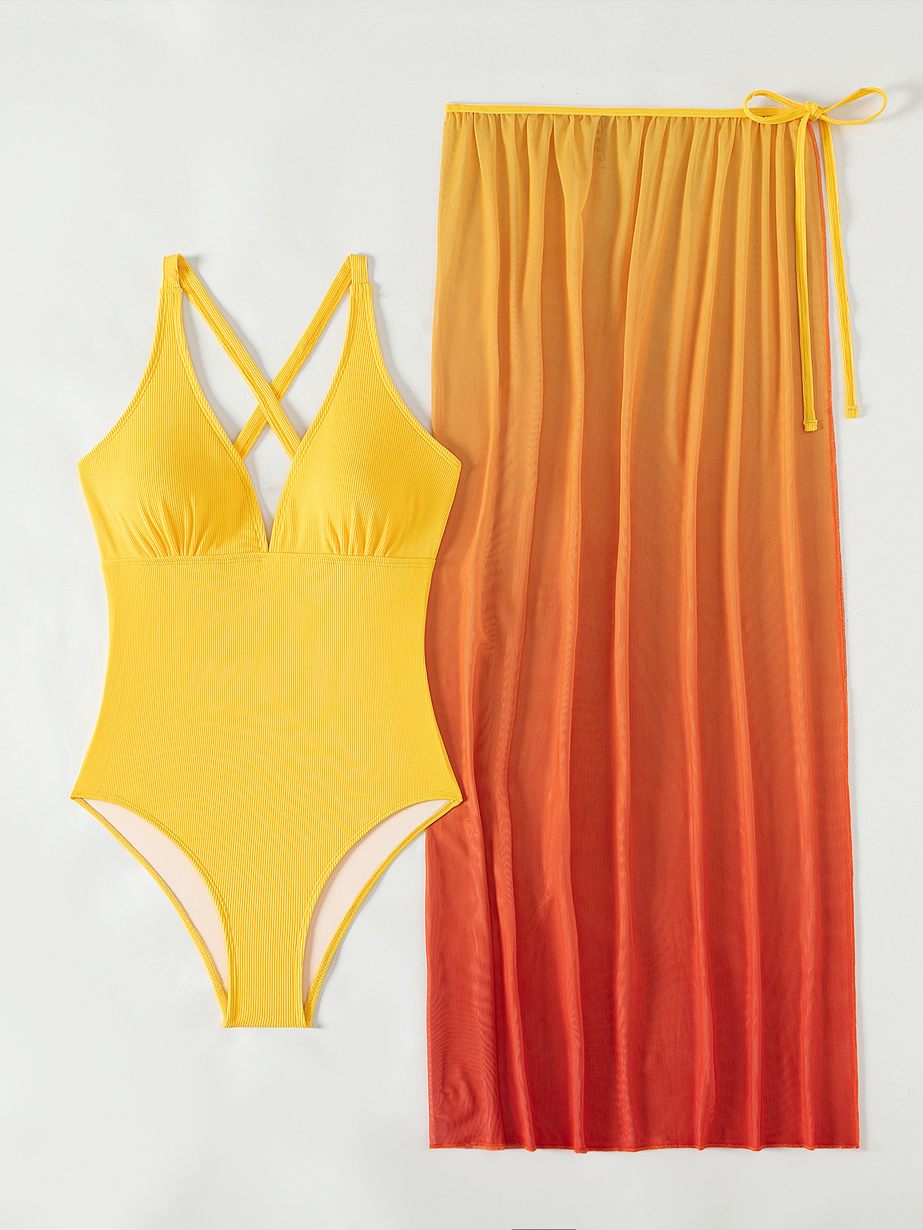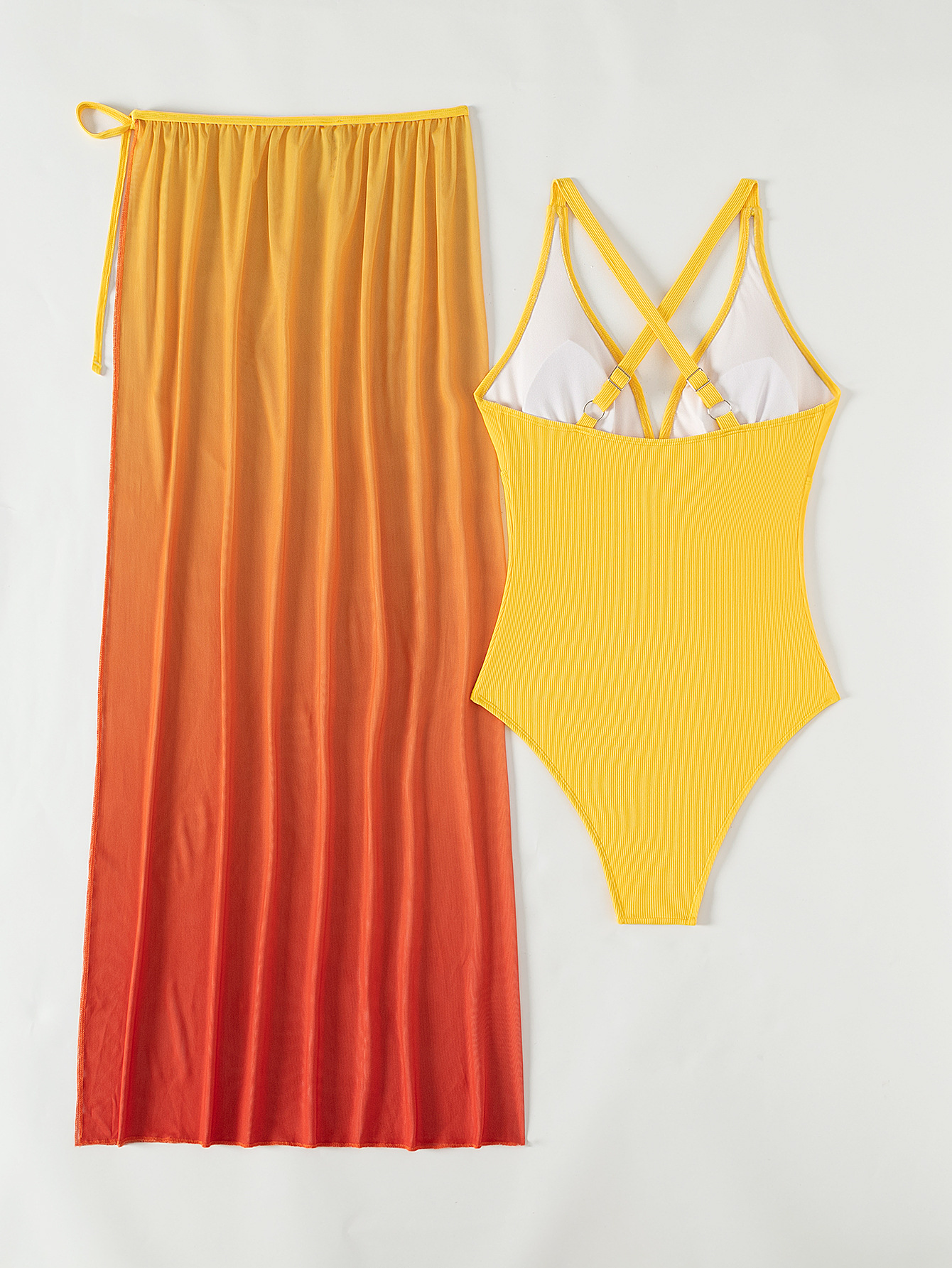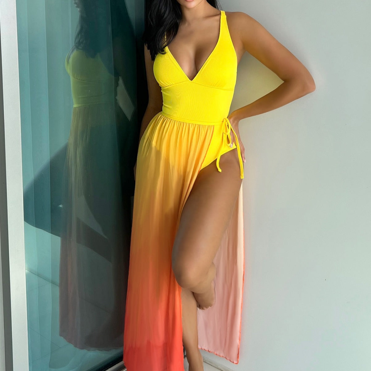 Yellow One Piece Bikini Swimsuit Gradient Cover up Beach Dress