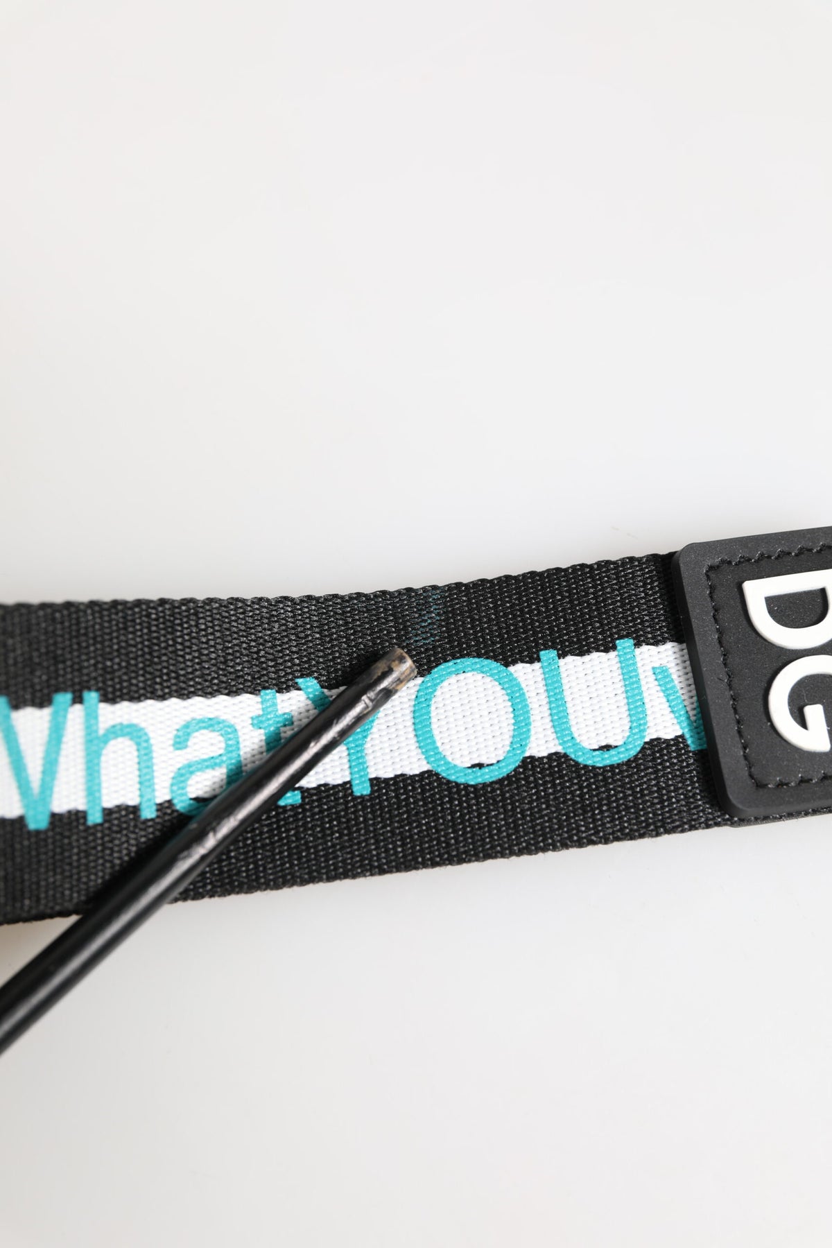 features a durable red polyester strap accented with the bold DG logo, paired with sleek silver-tone brass hardware. A stylish and practical accessory that adds a designer touch to your daily essentials.