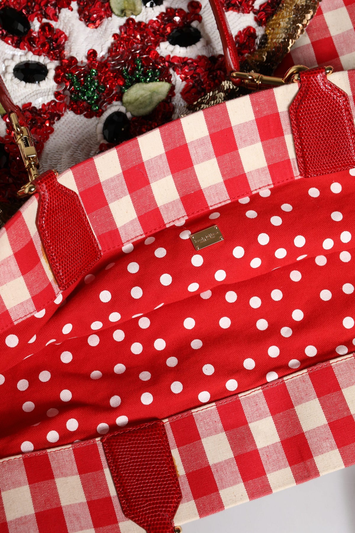 Gorgeous brand new, 100% Authentic Dolce & Gabbana red checkered embellished shopping tote cotton bag I LOVE PIZZA rhinestone-embellished tote bag.