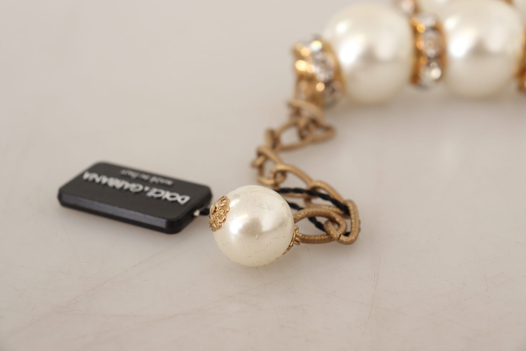 Gorgeous brand new with tags, 100% Authentic Dolce & Gabbana gold-tone necklace. Decorated with pearls of different sizes and golden inserts with white crystals.