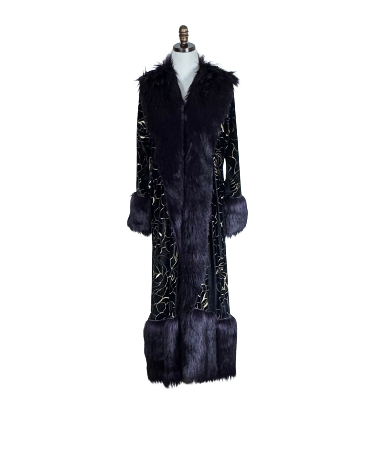 Indulge in golden dreams with the Jennafer Grace "Le Lido" Penny Deluxe. Handmade in Southern California, the "Le Lido" is fashioned from a tapestry of shimmering gold foiled velvet, and topped with the deepest plum faux fur trimmed cuffs, collar, and hem. Named for the famous Parisian cabaret, this coat will shine through the night and  reserve your place in the spotlight. The coat features deep, in-seam pockets for comfort, this bold beauty is an artsy addition to any wardrobe and sure to become a coveted heirloom piece.