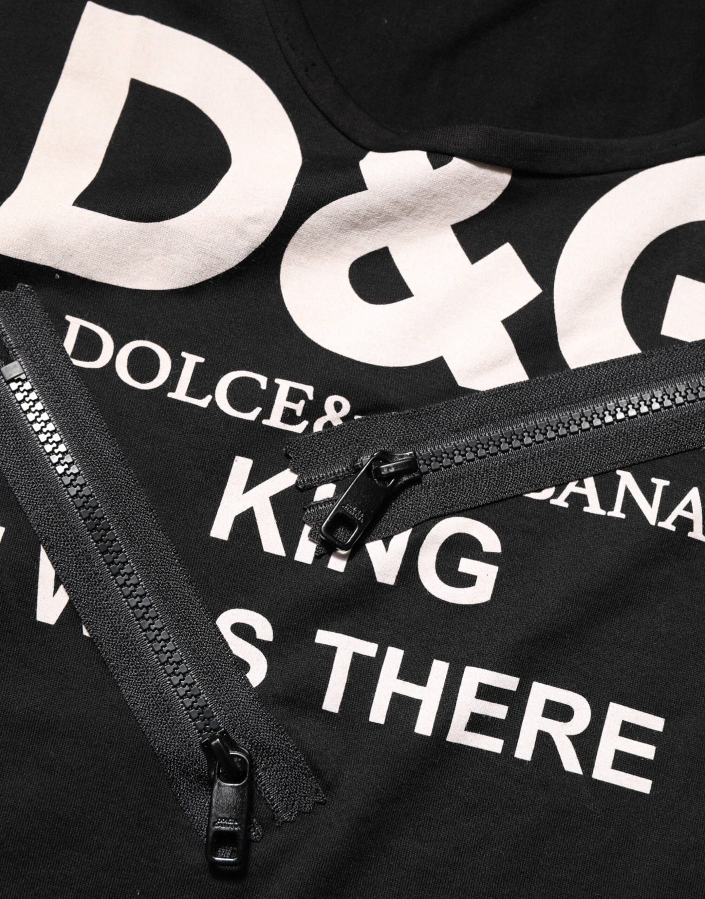 This limited edition, handmade black cotton tank features bold D&G logo print on the front with text details “King Was There”. It has a unique zipper detail across the chest for a modern, edgy look. Perfect for casual wear or layering.