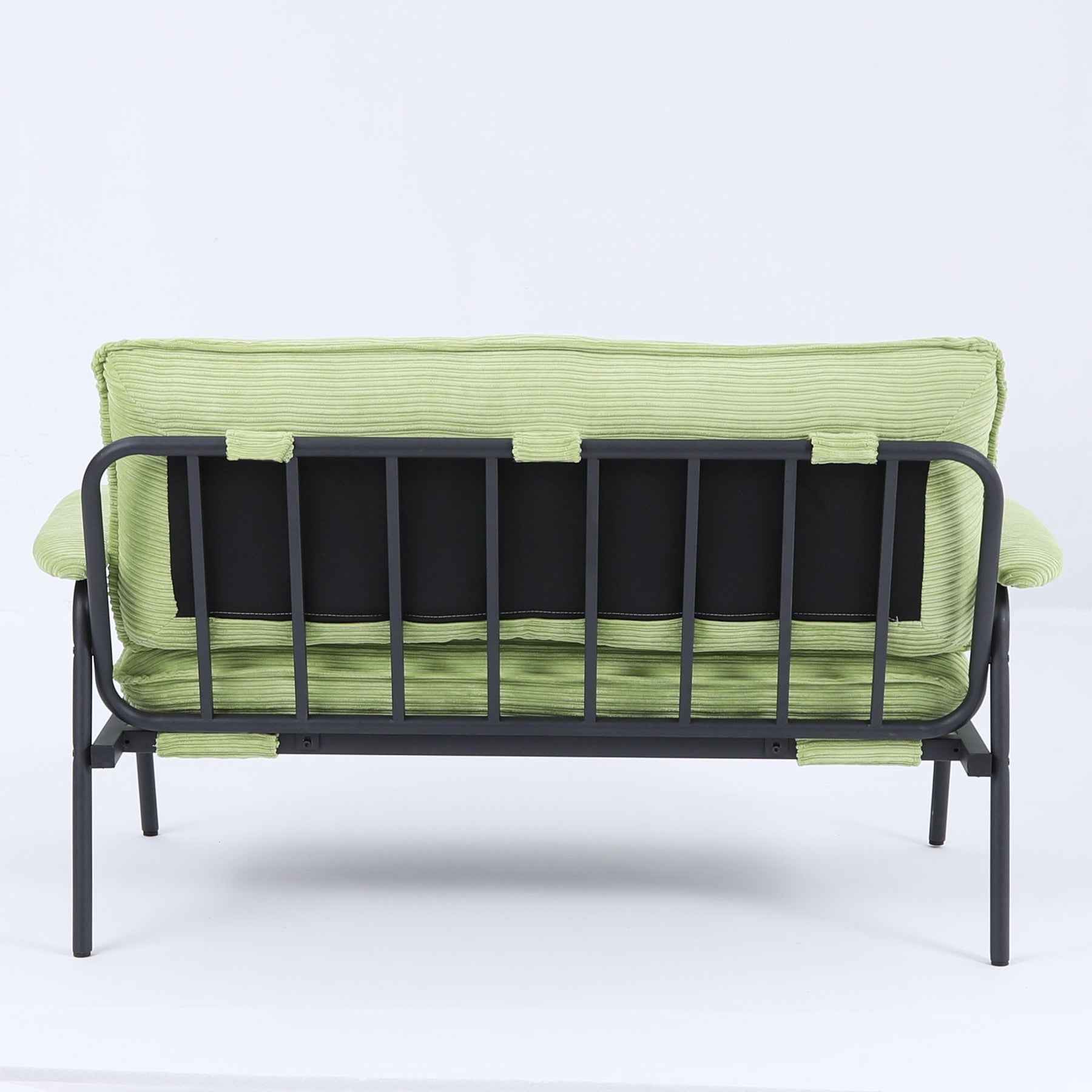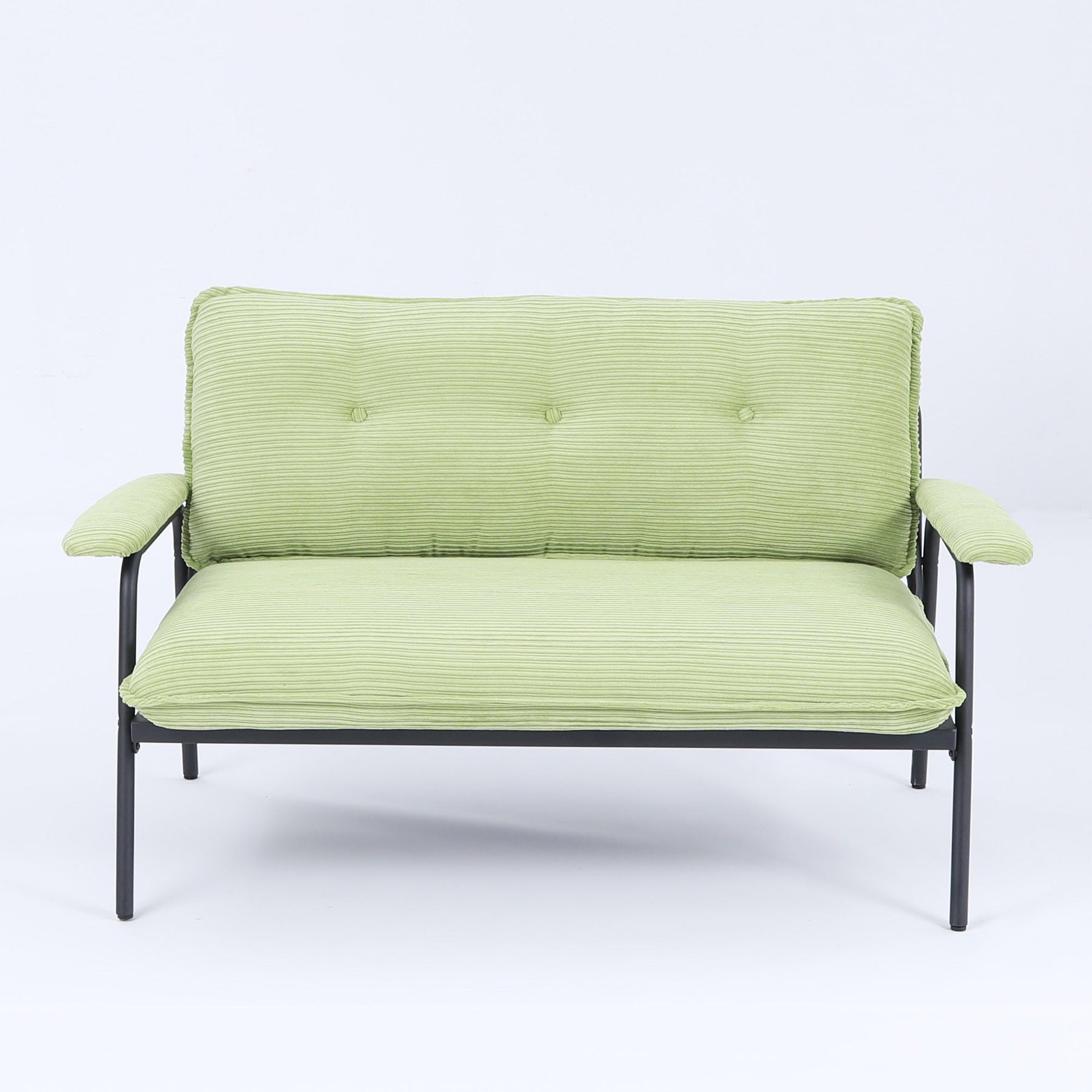 The fresh green, like the tender leaves just blooming in spring or the rippling lake water in summer, quietly tints the home with a natural poetic touch. The corduroy material is fine and skin-friendly. Every touch is a gentle caress. The exquisite stitching and button decorations outline a simple and elegant profile, exuding taste in a low-key manner. The black metal frame is strong and powerful, like a loyal guard, firmly bearing the weight of life and unafraid of the test of time. Its compact size doesn't take up much space. Whether placed by the sunny living room window, it becomes a small corner for reading and enjoying tea. It is still placed on the quiet balcony, accompanying you to overlook the afterglow of the setting sun, all in harmony.