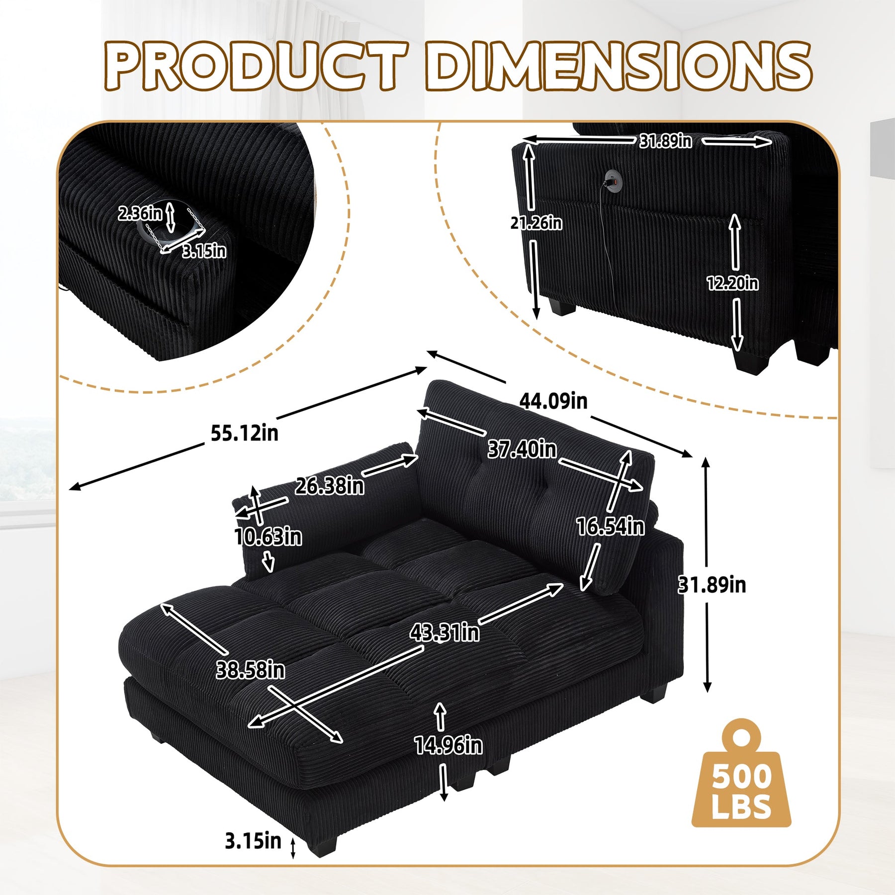 This sofa is designed with great ingenuity. It is equipped with side storage pockets, which can be used to neatly place various small items, meeting daily usage needs. At the same time, it is equipped with two cup holders that are stable and durable, ensuring the safe placement of all kinds of beverages. The backrest of the sofa is adjustable, allowing for flexible adjustment to a comfortable angle according to the user's needs, thus bringing users a pleasant and comfortable experience.