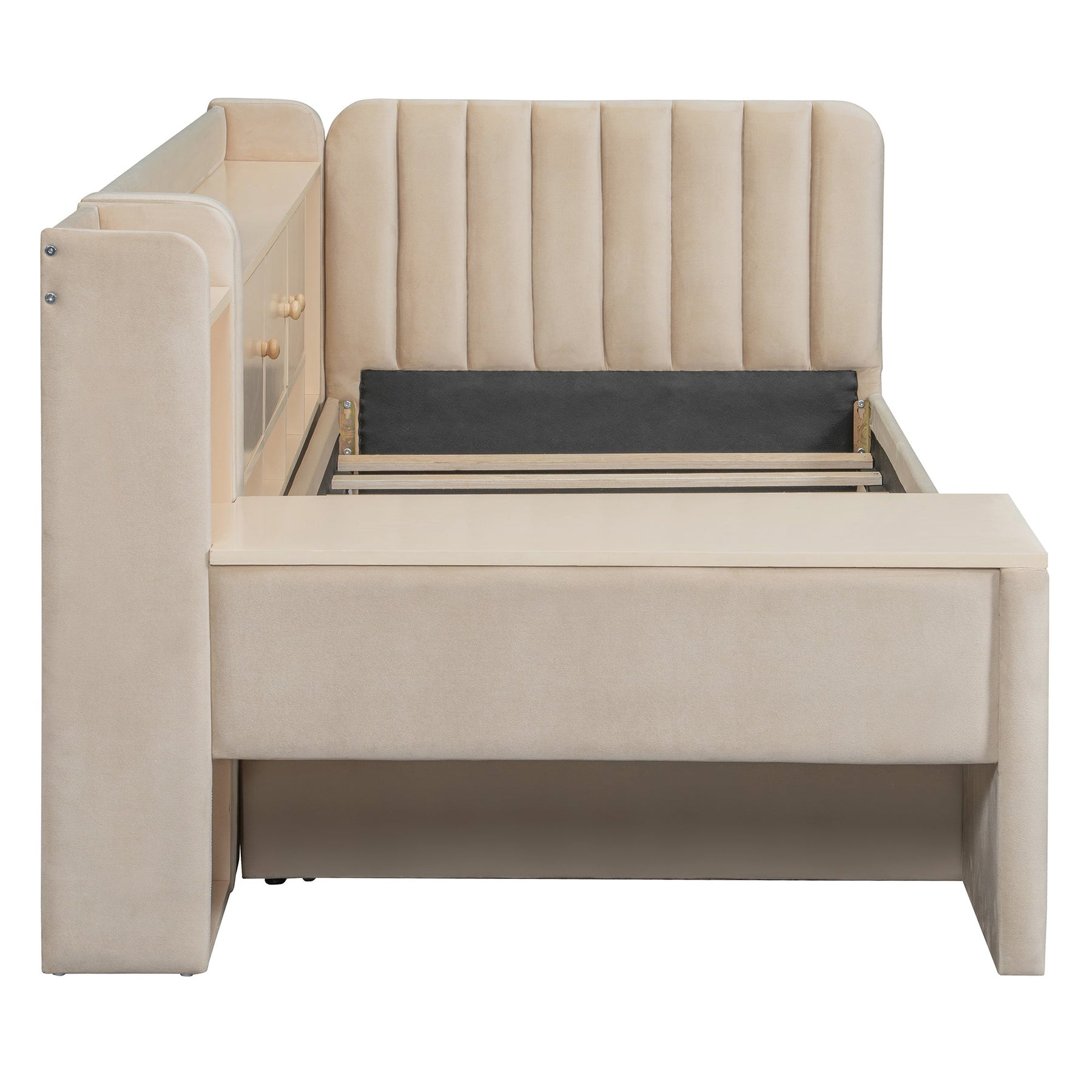 Twin Size Upholstered Daybed with Drawers, Shelves, Flip Cabinets & Side Table (Beige)