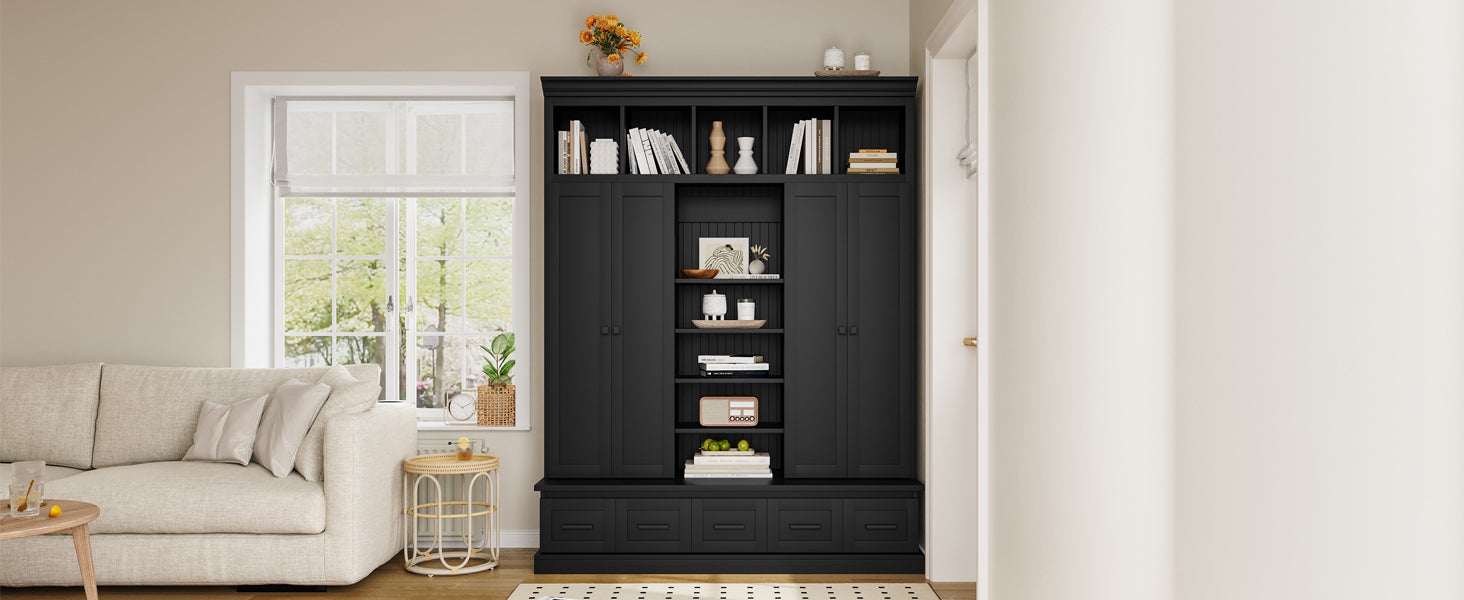 • Central storage and shelving: Featuring two enclosed cabinets located on each side of the central. And the middle portion of the hall tree includes four open shelving units that provide even more storage options. Ideal for storing or displaying books, baskets, shoes, or other items that benefit from easy accessibility. Totally, there are five shelves are adjustable, allowing for a personalized layout to maximize storage space.