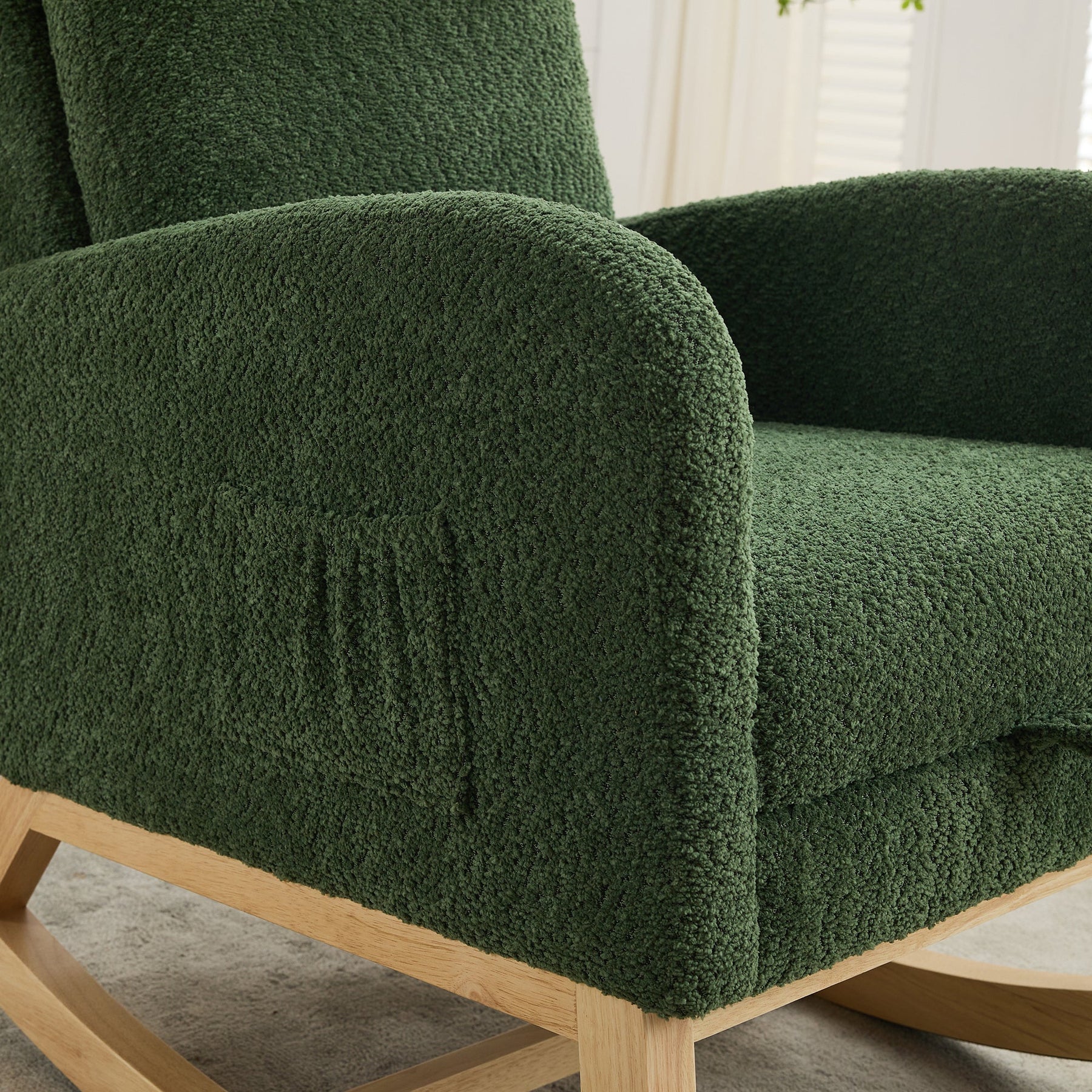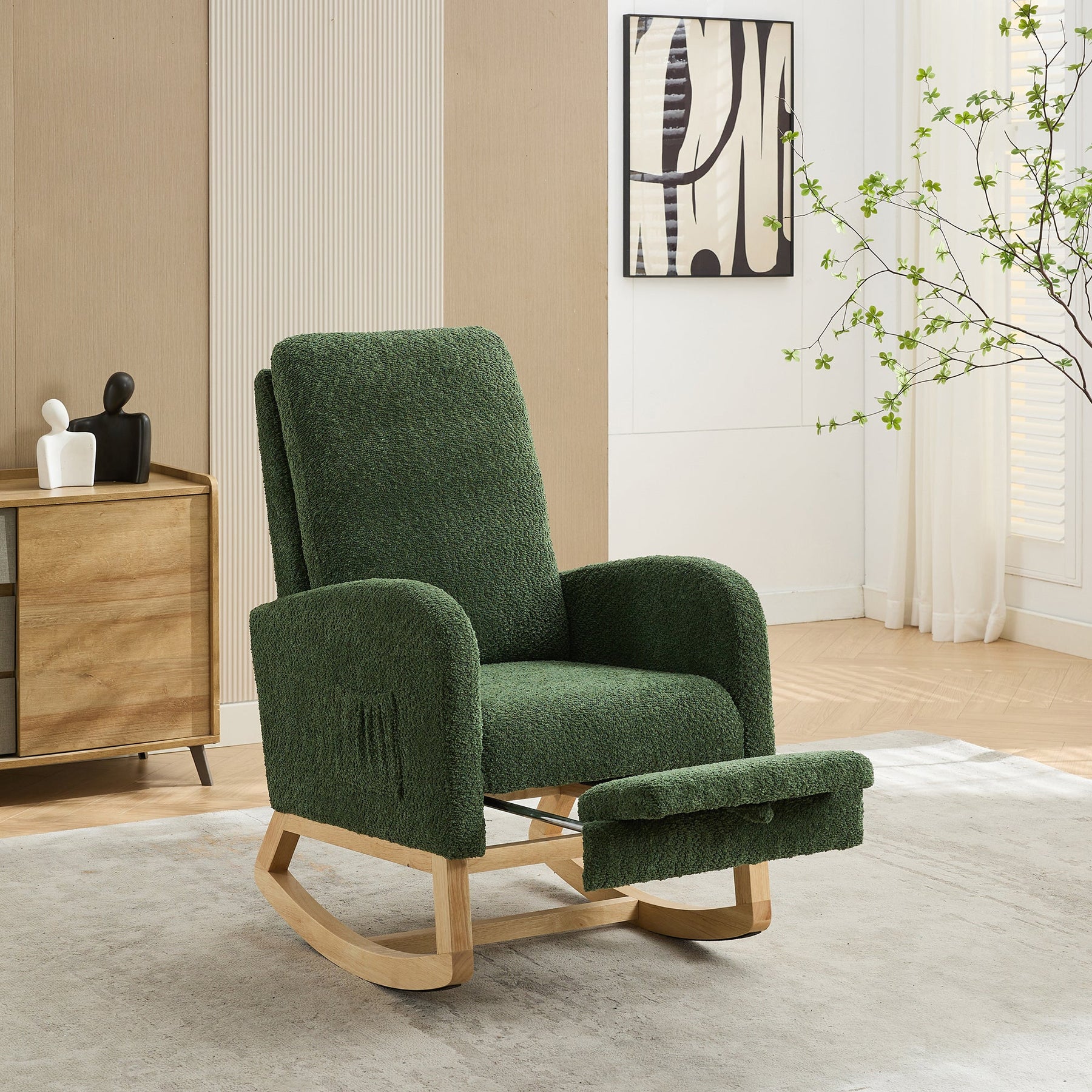 25.4'W Green Boucle High Back Glider Rocking Chair with Retractable Footrest and Rubber Wood Legs for Nursery and Living Room