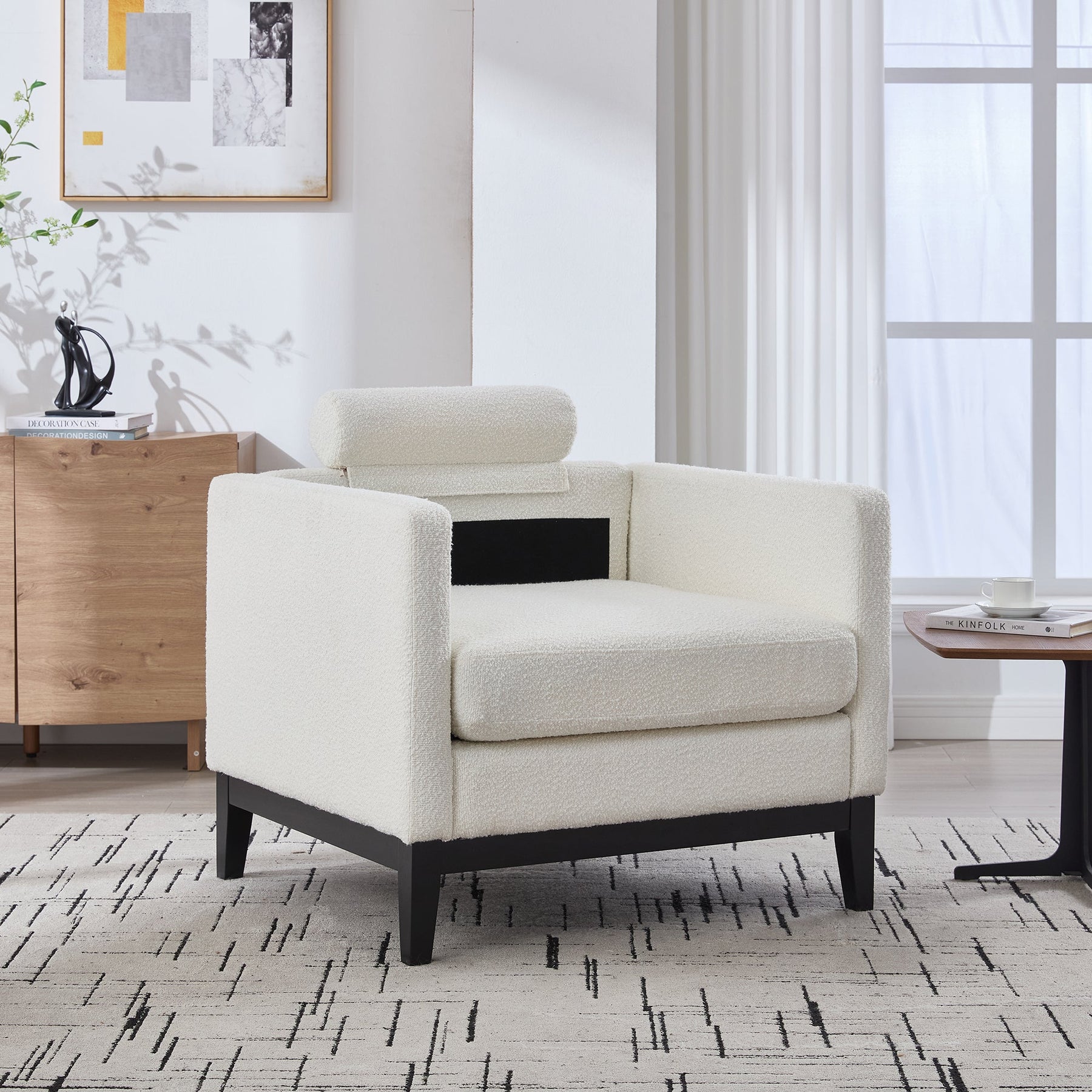 35.4' Wide Modern Farmhouse Performance Accent Chair with Black Finish Legs, Wood Base Reading Armchair Single Sofa with Two Bolster Pillows for Living Room Offices and Lounge, Ivory Boucle.