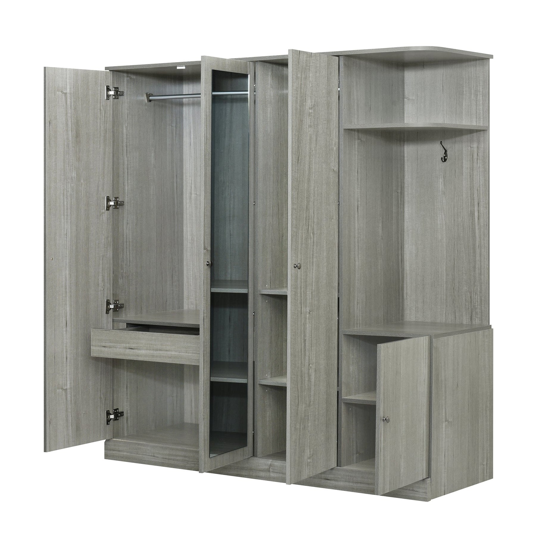 4-Door Wardrobe with Shelves, Drawers, and Full-Length Mirror, Gray