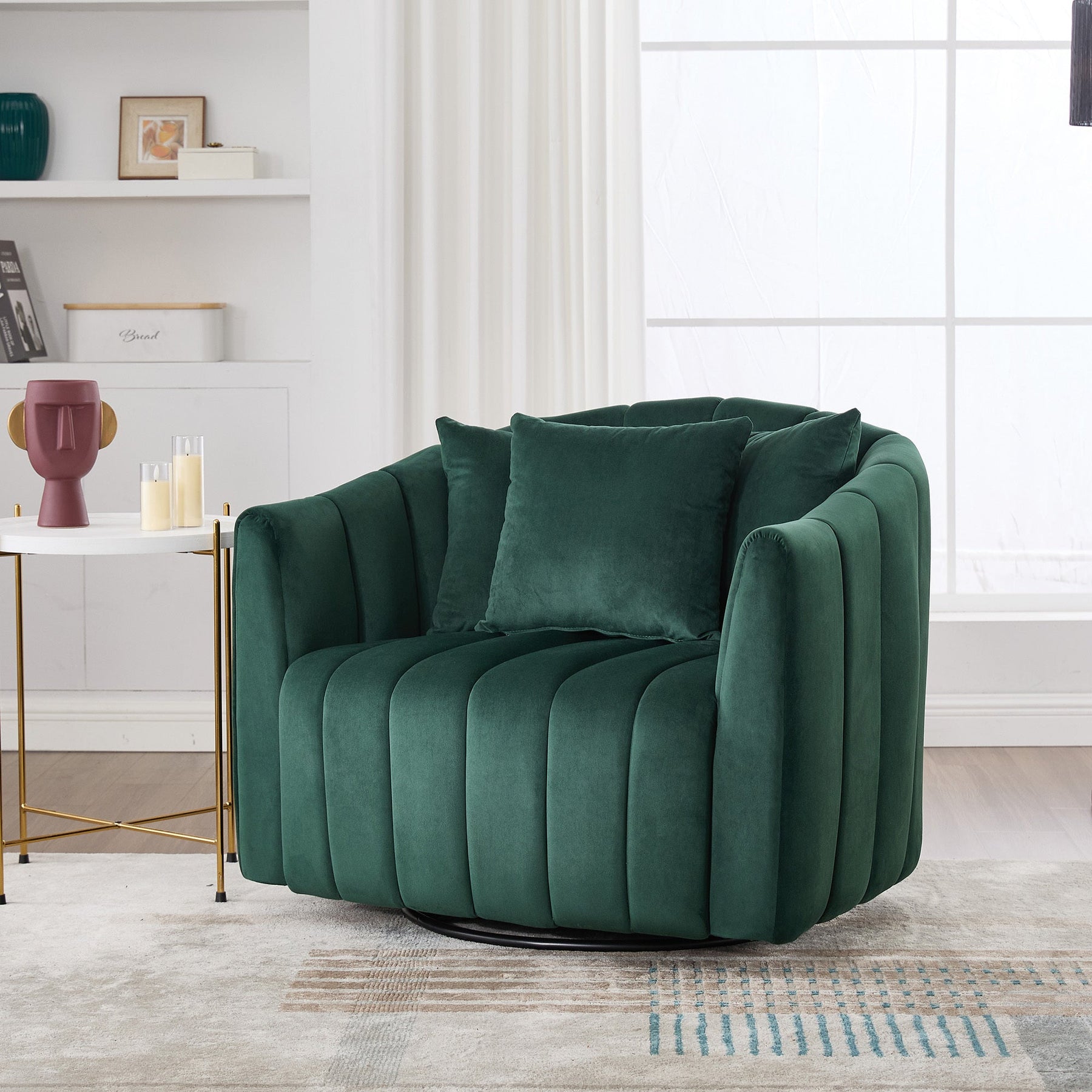 40.35'W Upholstered Oversized 360° Swivel Accent Barrel Chair and Half Cozy Sofa with 3 Pillows, Velvet Channel Tufted Pumpkin-Shape Club Armchair for Living Room, Bedroom, Office, Lounge, Green