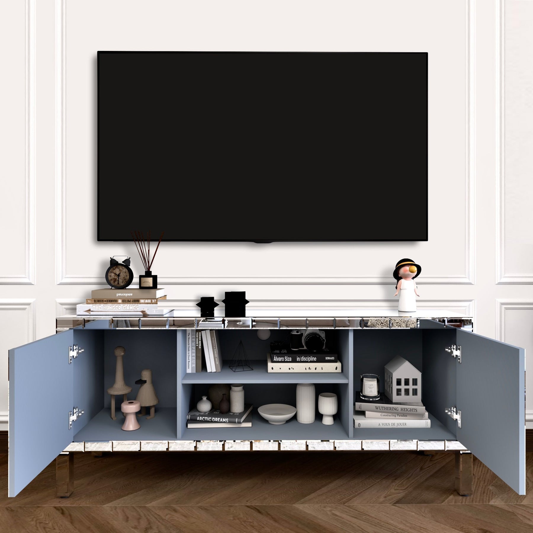 With plenty of storage space and a gleaming mirror finish, this versatile TV stand adds plenty of glamour and style to your living room. Its 60-inch wide frame is made of solid wood and glass with an antique silver finish and is built on a pedestal-style base. Two cabinet doors feature a gleaming vertical and horizontal style with brushed steel knobs. Each individual cabinet door opens to hold board games, books and dvds.Plus, this TV stand has two open shelves in the middle, perfect for your cable box and game console.