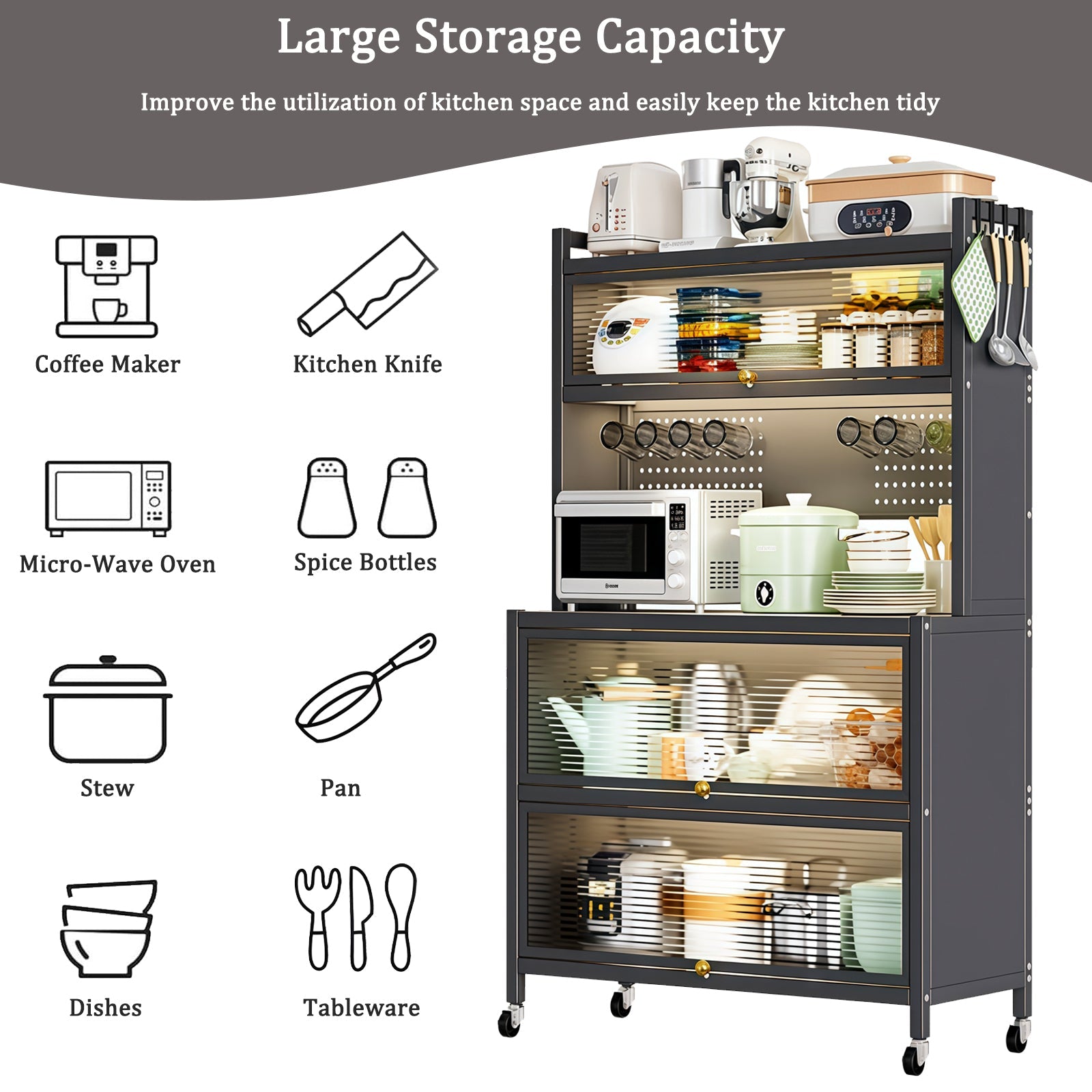 • Large Storage Space: The 5-layer large-capacity space of this kitchen storage bakers rack (3 closed cabinet doors + 2 open shelves) can accommodate appliances such as microwave ovens and coffee machines, or be used as a spice rack, wine rack, and bookshelf; from kitchen storage to living room display, coffee bar to study storage, it can adapt to various family scenes. ​