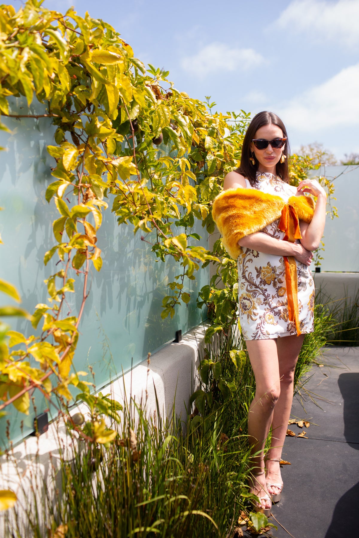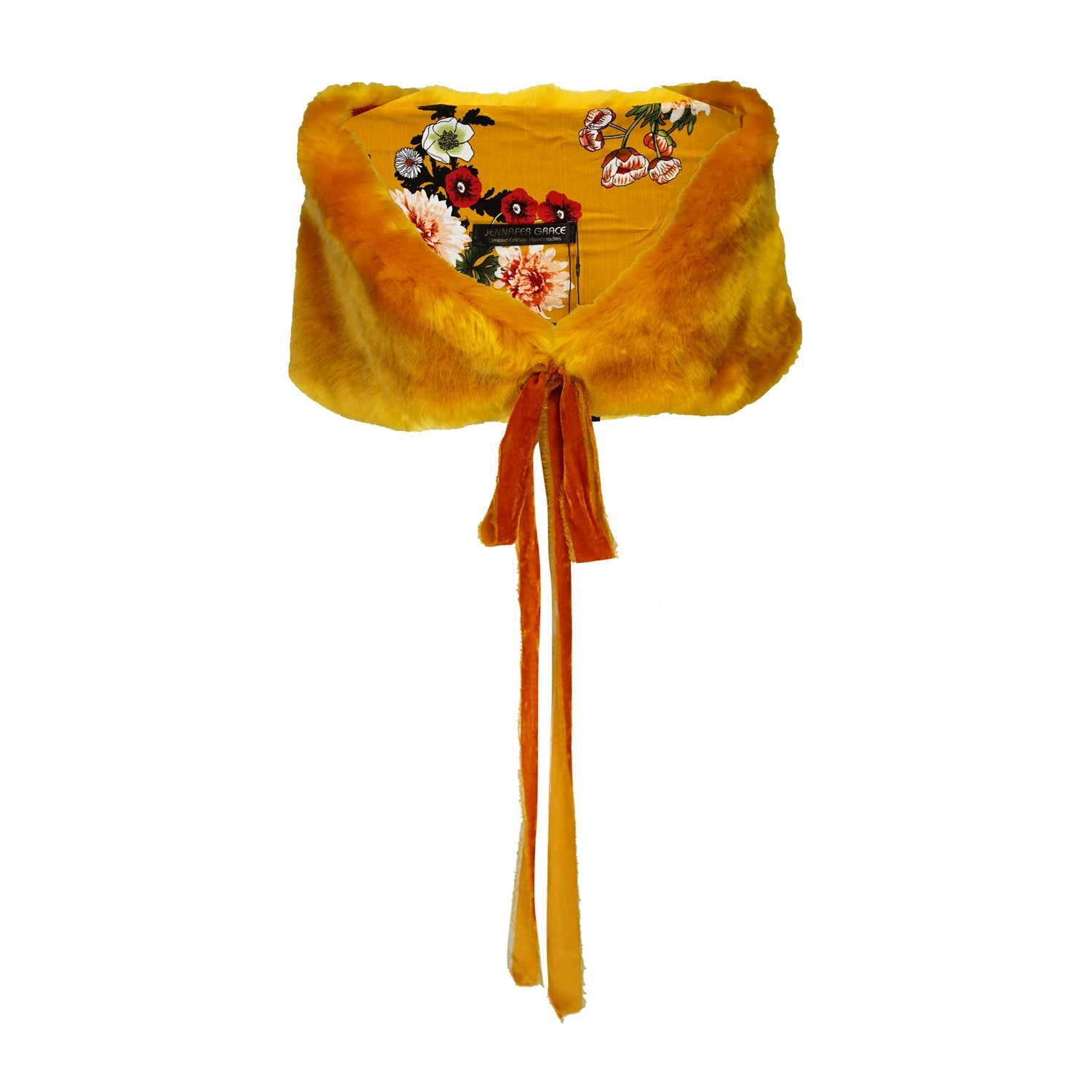 This luscious amber colored faux fur stole from Jennafer Grace is accented with contrasting lining and a velvet tie at the ends. She is the perfect accessory to "glam" up a casual look or keep you warm at a red carpet. Made with a super luxe rich amber colored faux fur, synthetic lining and lots of love!